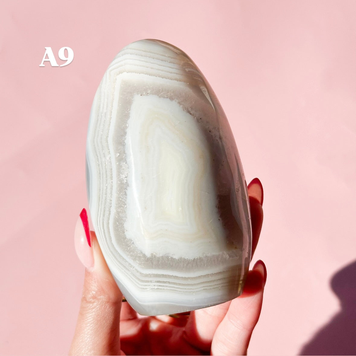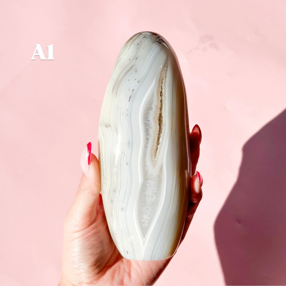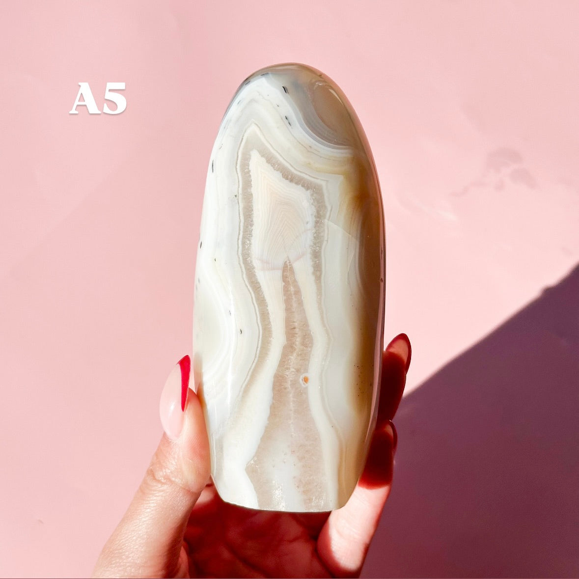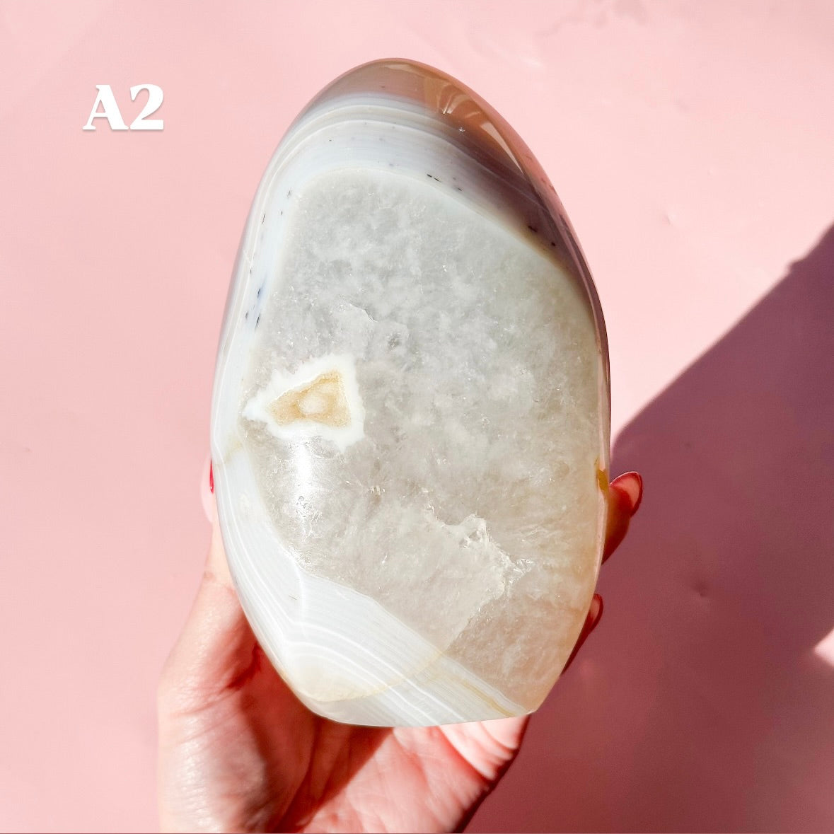Discover the quiet strength and timeless beauty of this Agate Freeform, a crystal known for its deeply grounding and stabilizing energy. Each piece is uniquely shaped to highlight the stone’s natural flow, with mesmerizing bands of earthy tones, ranging from soft greys and creams to rich browns, blues, or even translucent layers. Whether smooth and polished or featuring raw geode inclusions, every freeform is a one-of-a-kind expression of nature’s artistry.