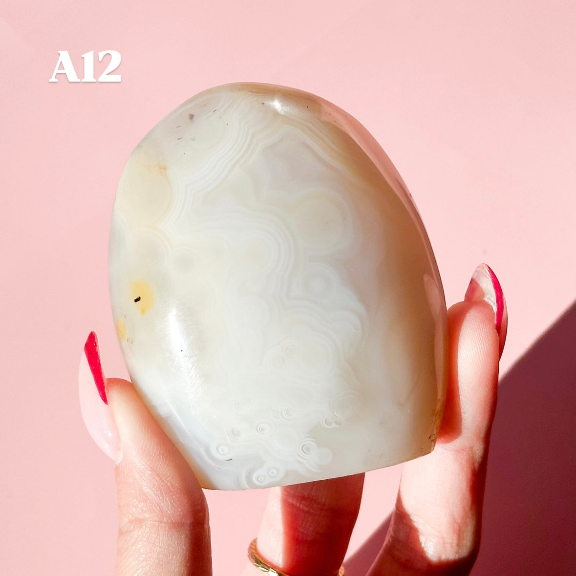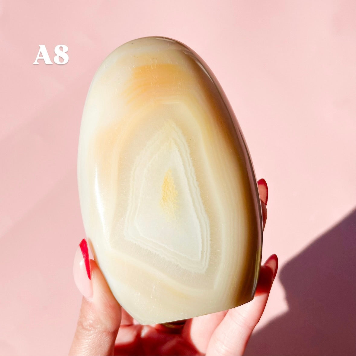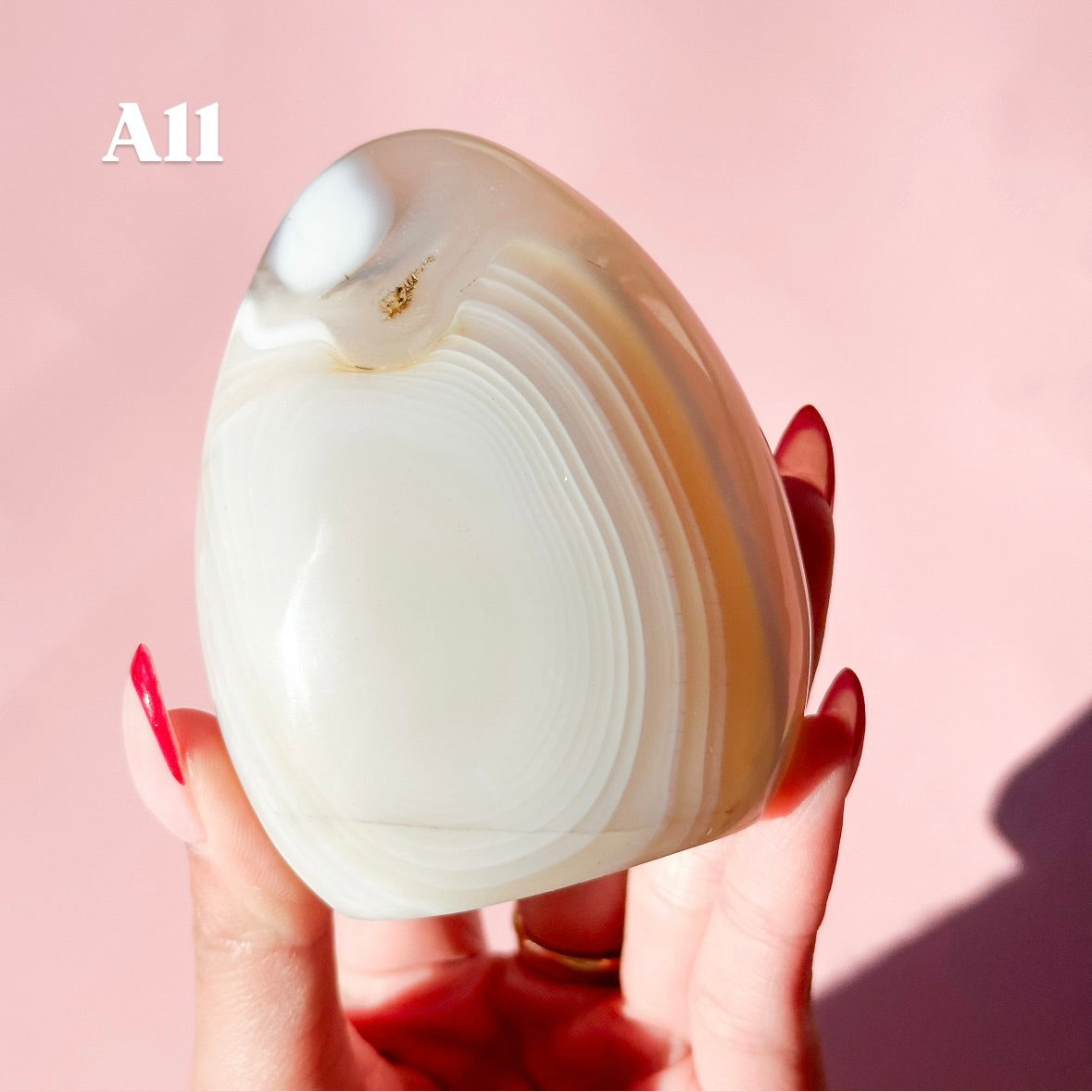 Discover the quiet strength and timeless beauty of this Agate Freeform, a crystal known for its deeply grounding and stabilizing energy. Each piece is uniquely shaped to highlight the stone’s natural flow, with mesmerizing bands of earthy tones, ranging from soft greys and creams to rich browns, blues, or even translucent layers. Whether smooth and polished or featuring raw geode inclusions, every freeform is a one-of-a-kind expression of nature’s artistry.
