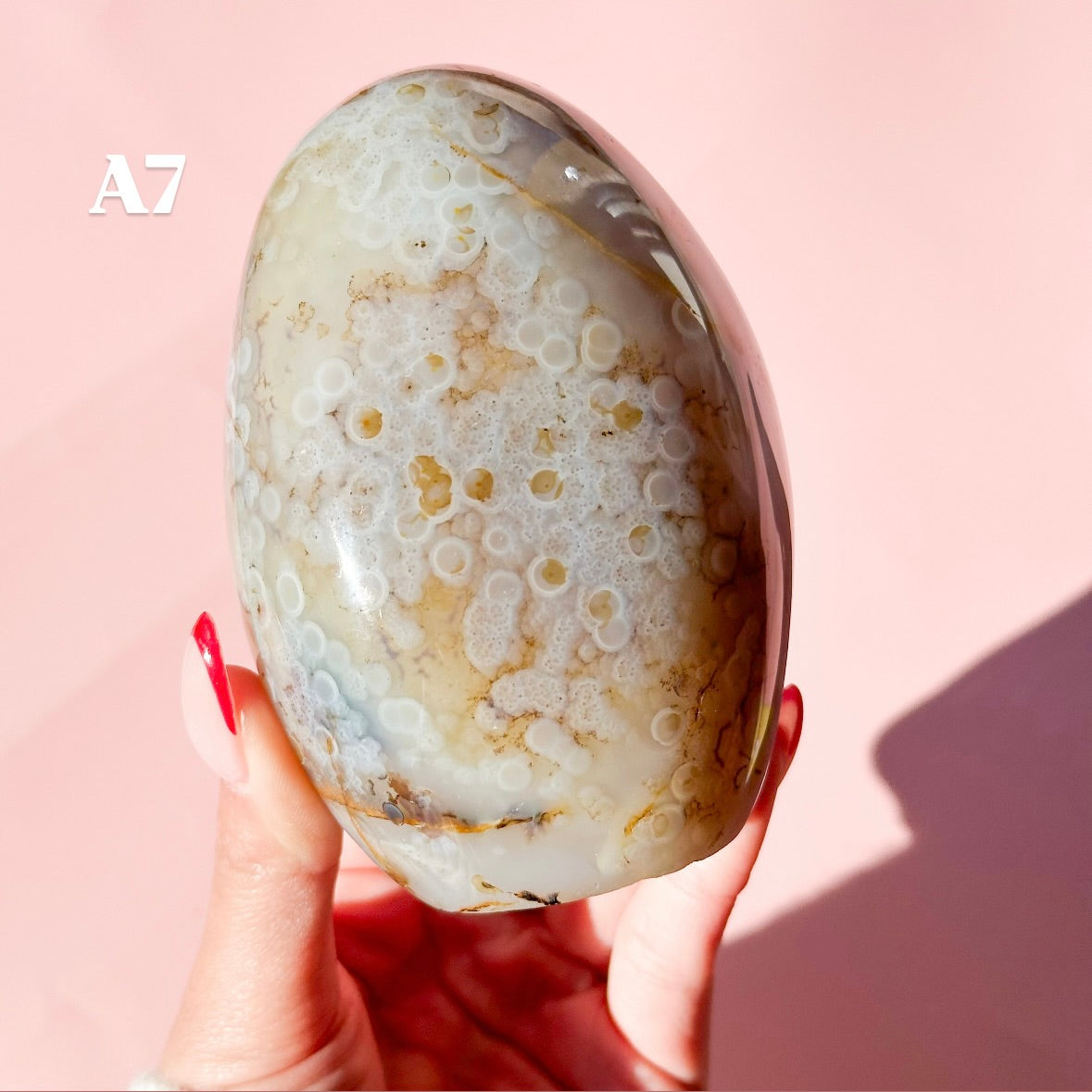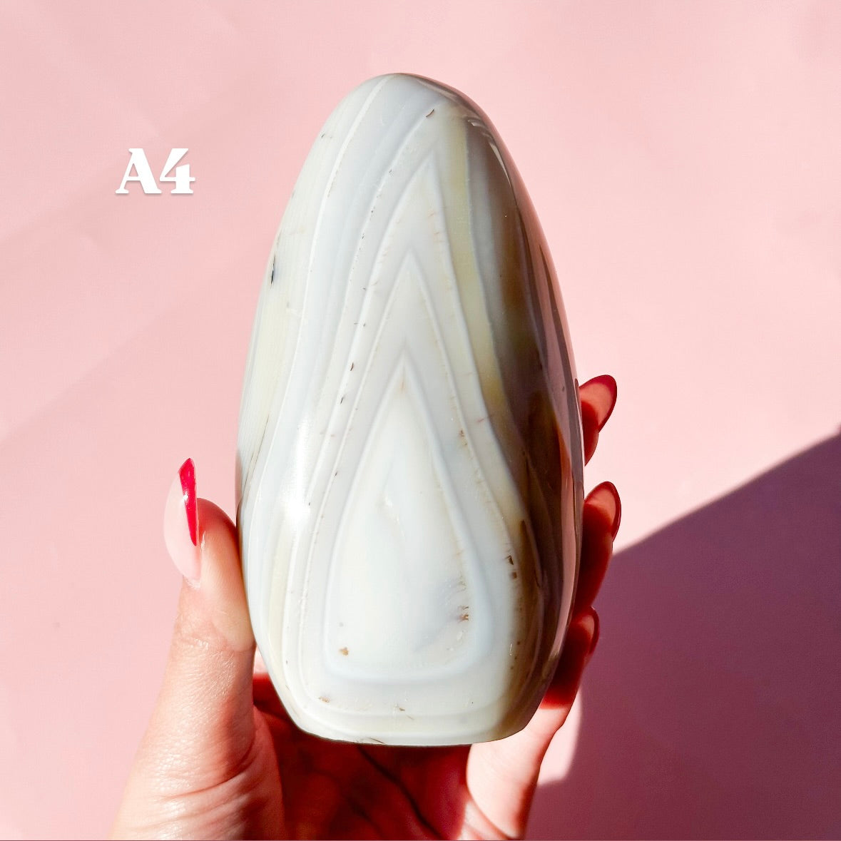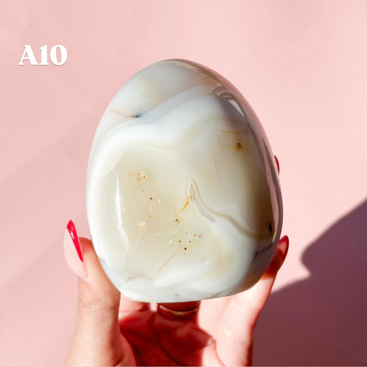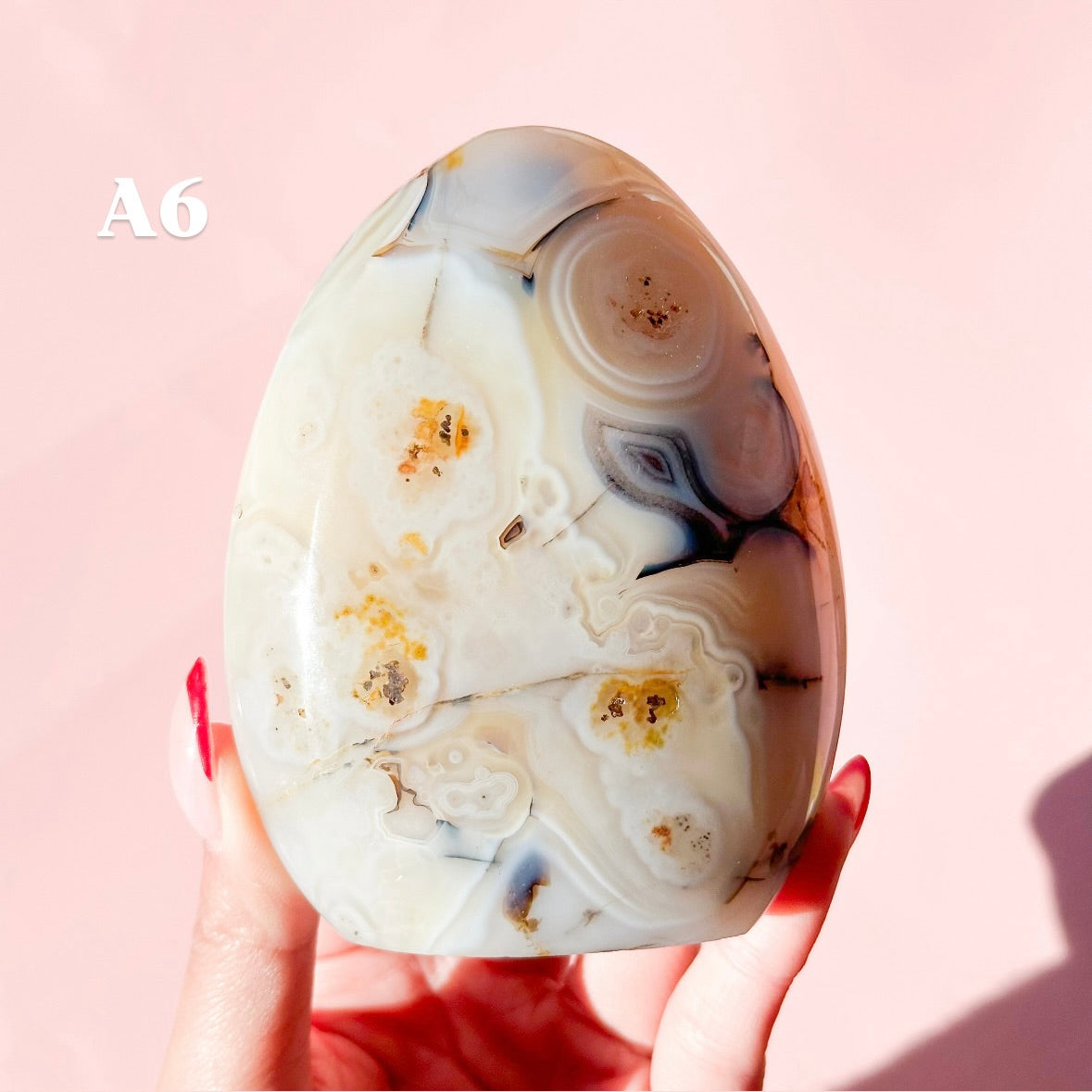 Discover the quiet strength and timeless beauty of this Agate Freeform, a crystal known for its deeply grounding and stabilizing energy. Each piece is uniquely shaped to highlight the stone’s natural flow, with mesmerizing bands of earthy tones, ranging from soft greys and creams to rich browns, blues, or even translucent layers. Whether smooth and polished or featuring raw geode inclusions, every freeform is a one-of-a-kind expression of nature’s artistry.