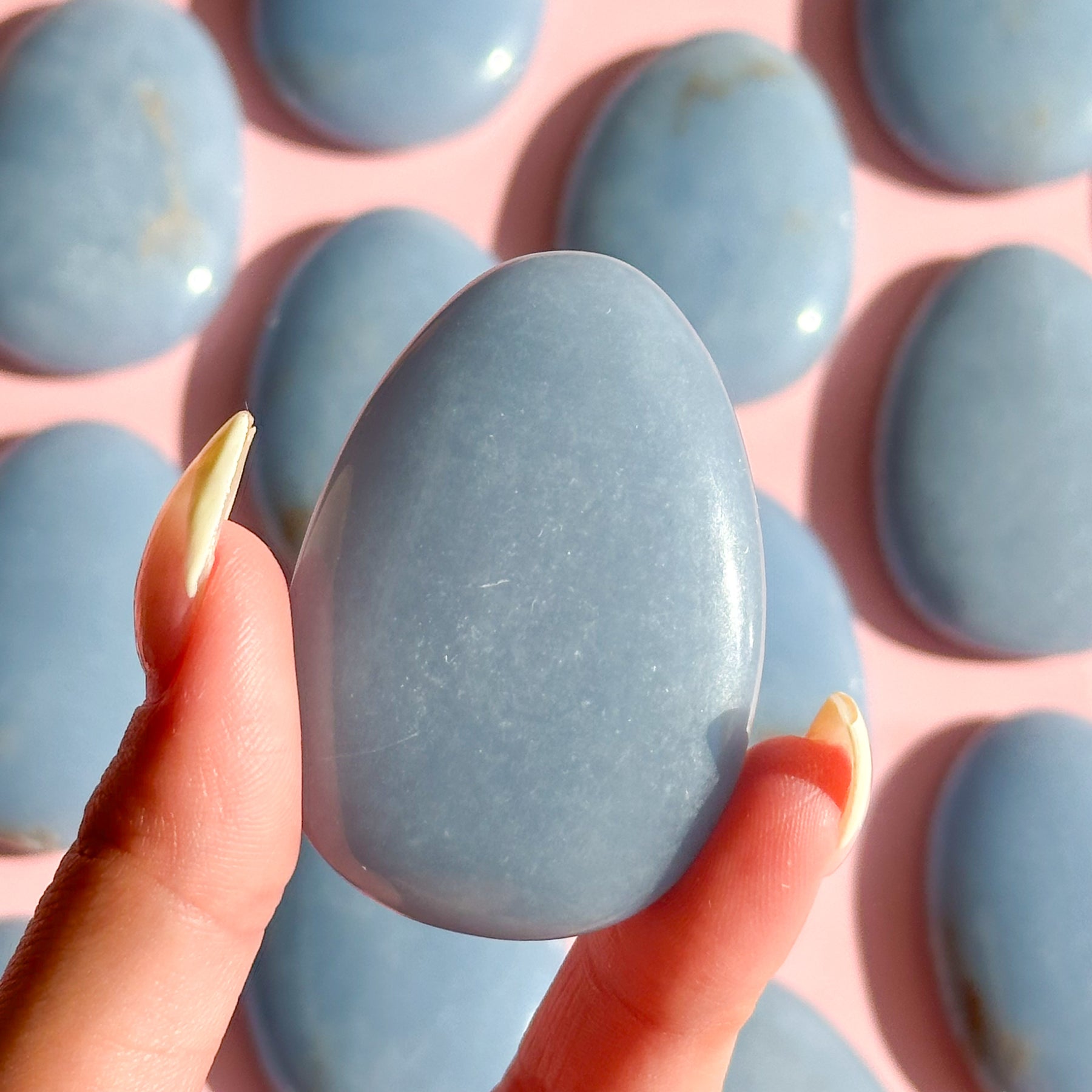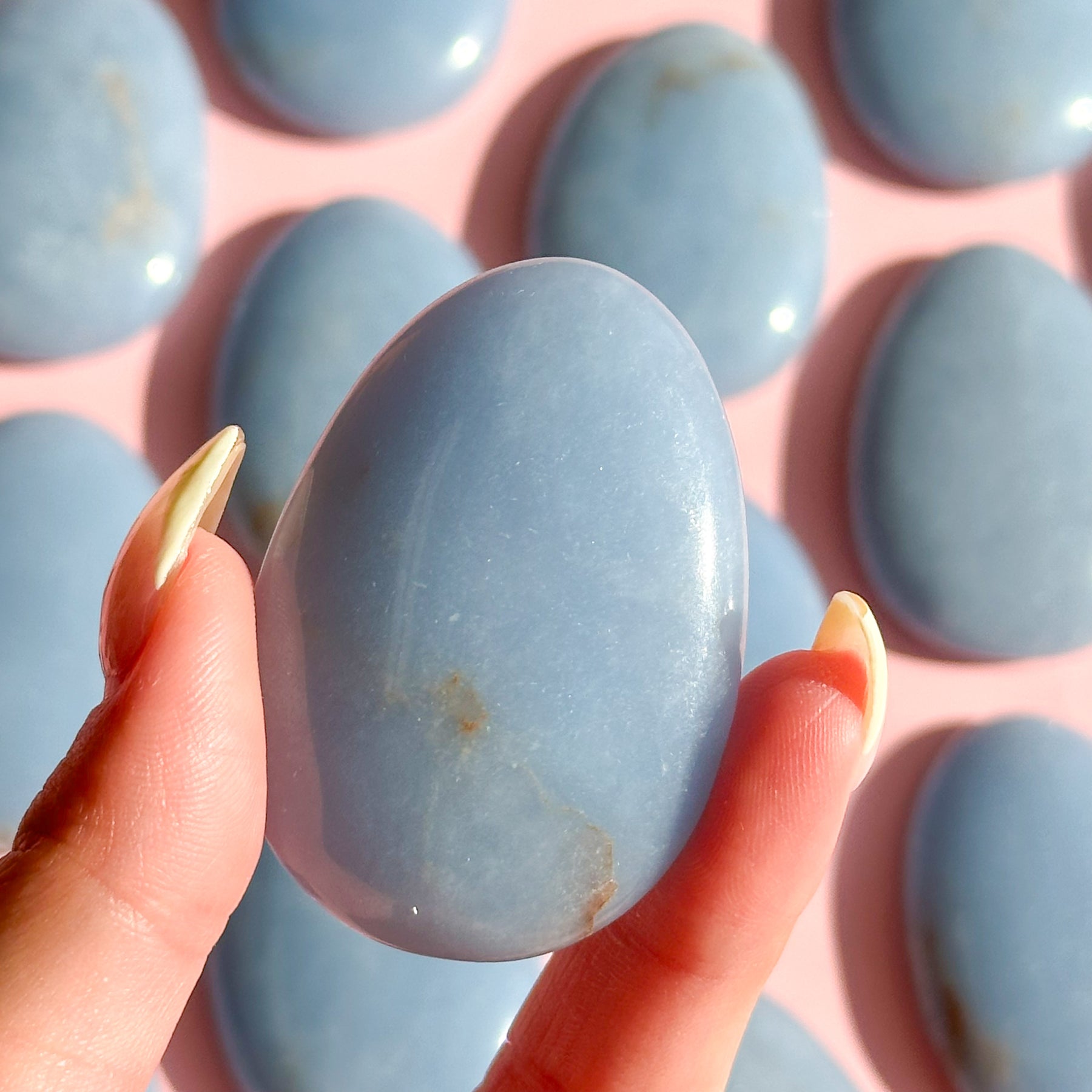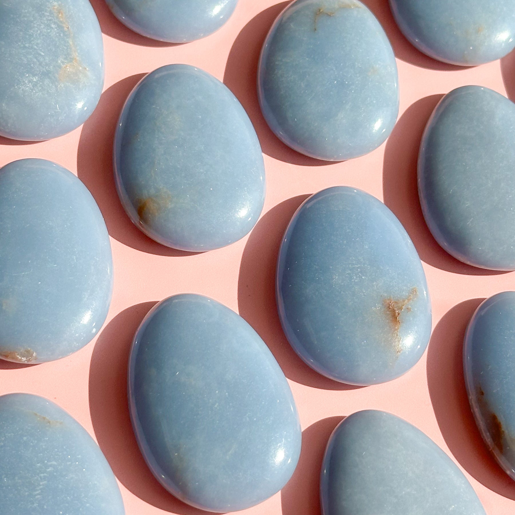 Angelite is a celestial, powder-blue stone that releases a calming and soothing energy that can help people feel more tranquil and reassured. The name comes from its association with angels and spirit guides. Angelite can also help people let go of negative thoughts and stress, which may help with sleep. Its soothing blue color promotes peace, tranquility, and gentle energy, helping to dispel fear, anger, and anxiety. This beautiful blue stone helps process grief, making it a perfect stone to carry around every day.