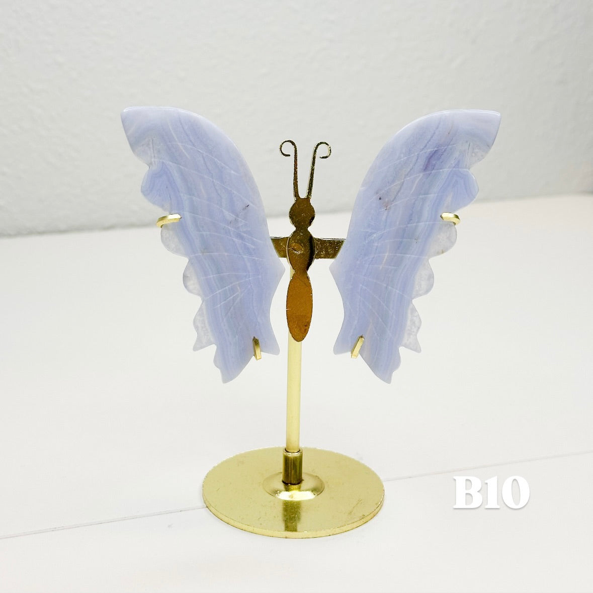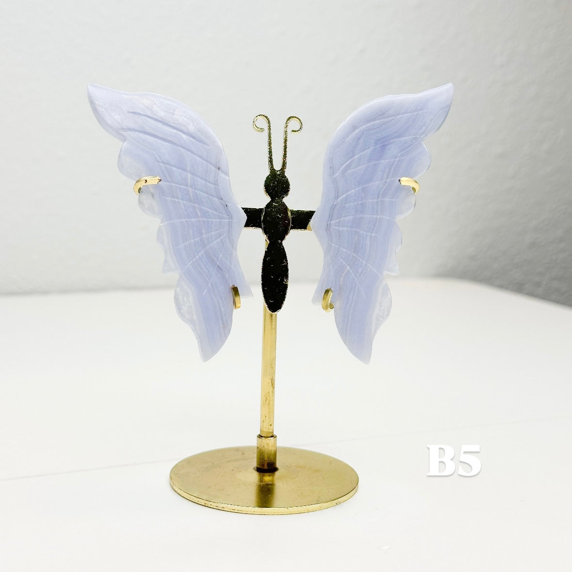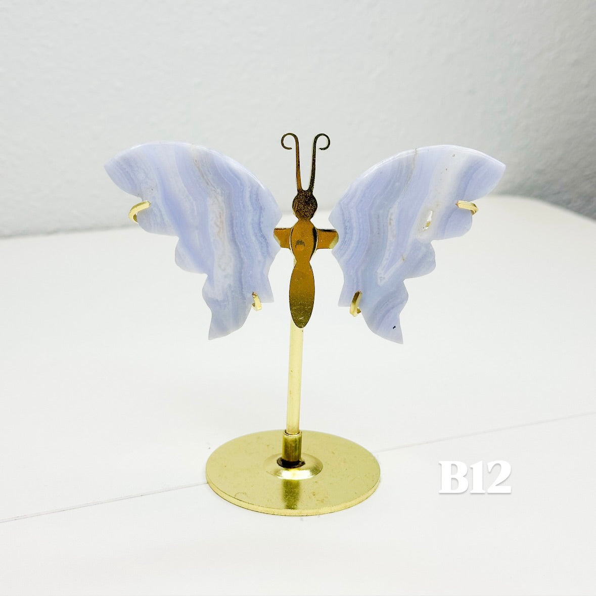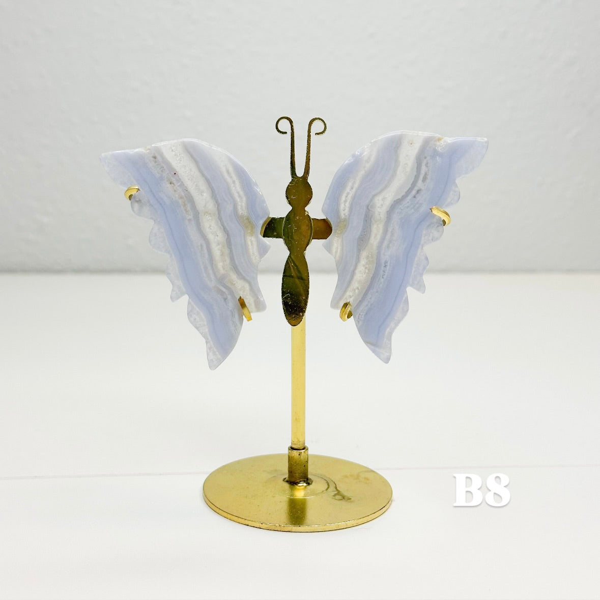 Let this ethereal blue lace agate butterfly carry your worries away on beautiful wings. With colors of blue, pink, white, and purple, this blue lace agate is displayed on a brass stand, allowing each butterfly to showcase the stone's signature soft colors that flow like clouds across a tranquil sky. Each butterfly is naturally unique, with its own distinct banding patterns and coloring; no two are alike. The brass stand allows your butterfly to stand out, catching light and attention while radiating its peaceful energy throughout your space.