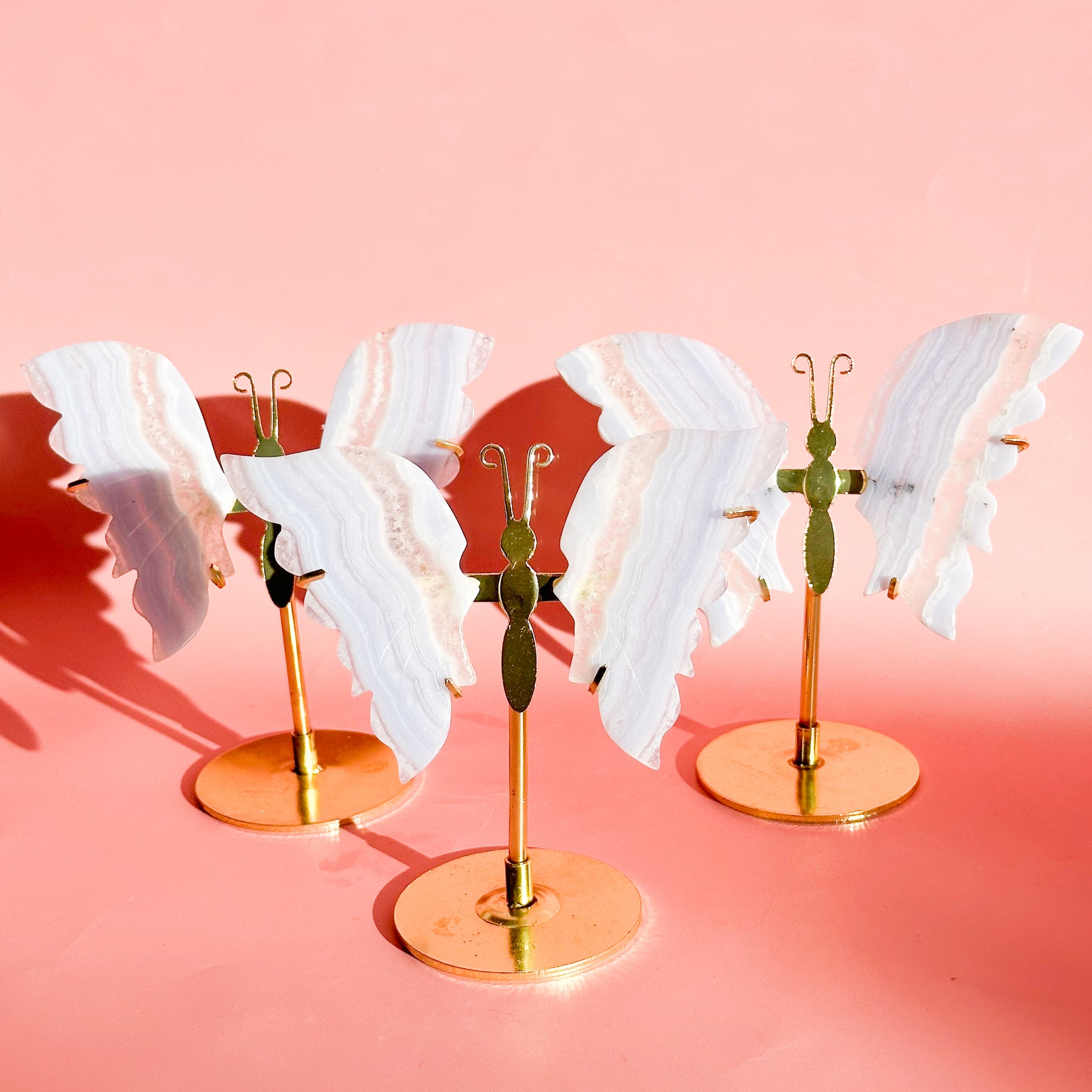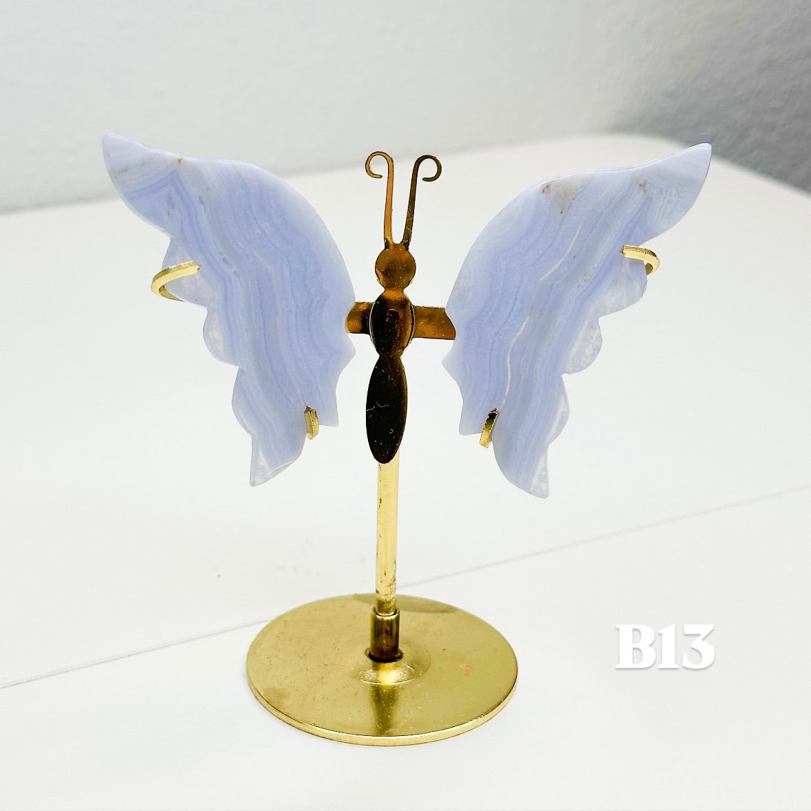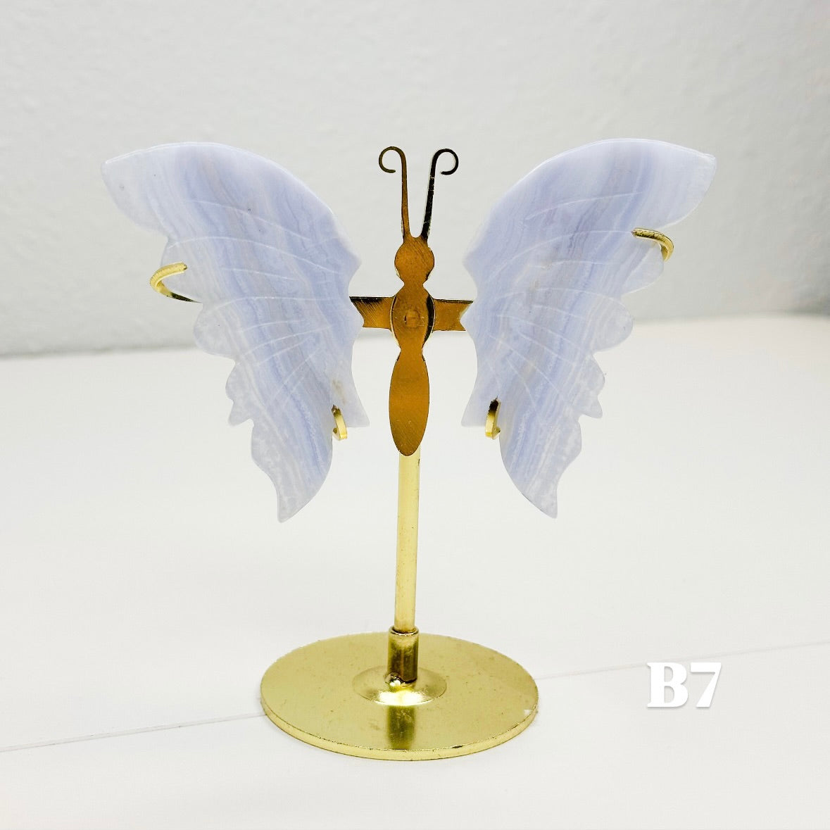 Let this ethereal blue lace agate butterfly carry your worries away on beautiful wings. With colors of blue, pink, white, and purple, this blue lace agate is displayed on a brass stand, allowing each butterfly to showcase the stone's signature soft colors that flow like clouds across a tranquil sky. Each butterfly is naturally unique, with its own distinct banding patterns and coloring; no two are alike. The brass stand allows your butterfly to stand out, catching light and attention while radiating its peaceful energy throughout your space.
