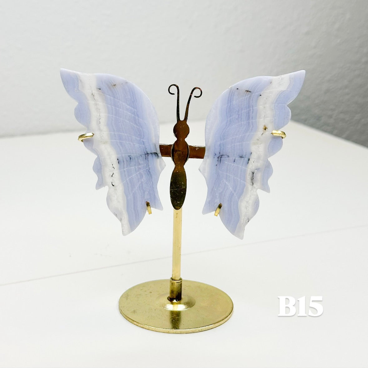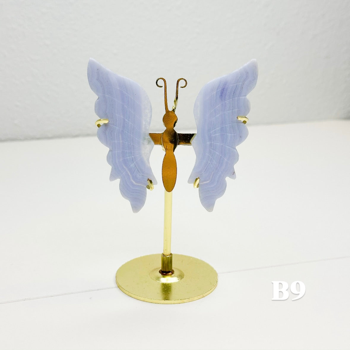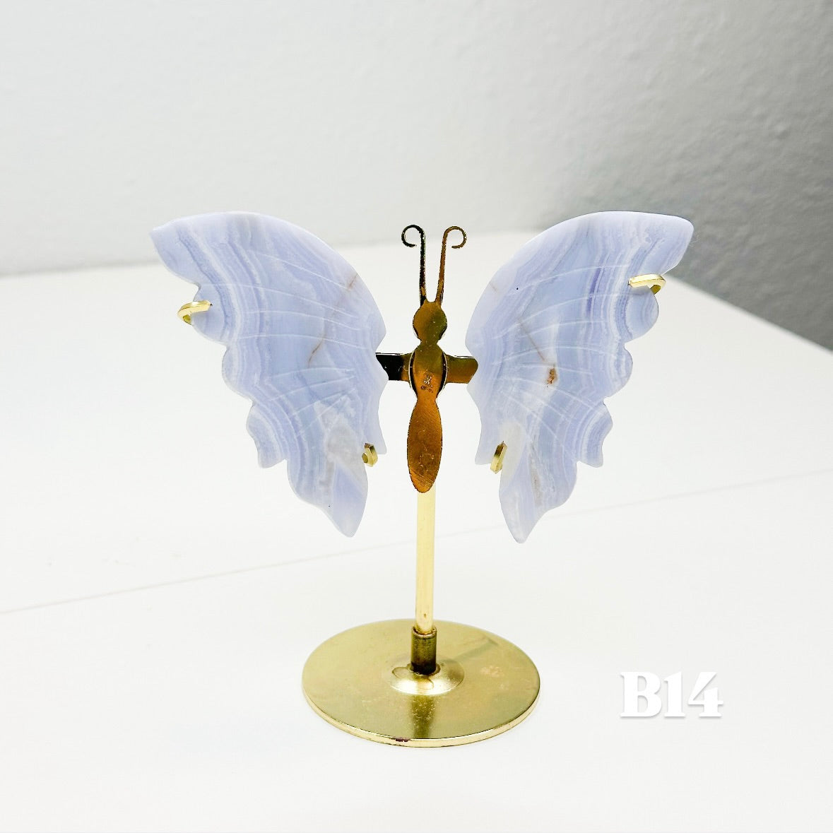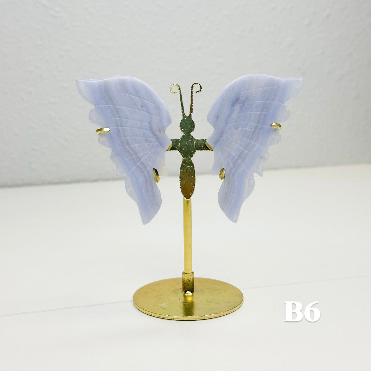 Let this ethereal blue lace agate butterfly carry your worries away on beautiful wings. With colors of blue, pink, white, and purple, this blue lace agate is displayed on a brass stand, allowing each butterfly to showcase the stone's signature soft colors that flow like clouds across a tranquil sky. Each butterfly is naturally unique, with its own distinct banding patterns and coloring; no two are alike. The brass stand allows your butterfly to stand out, catching light and attention while radiating its peaceful energy throughout your space.