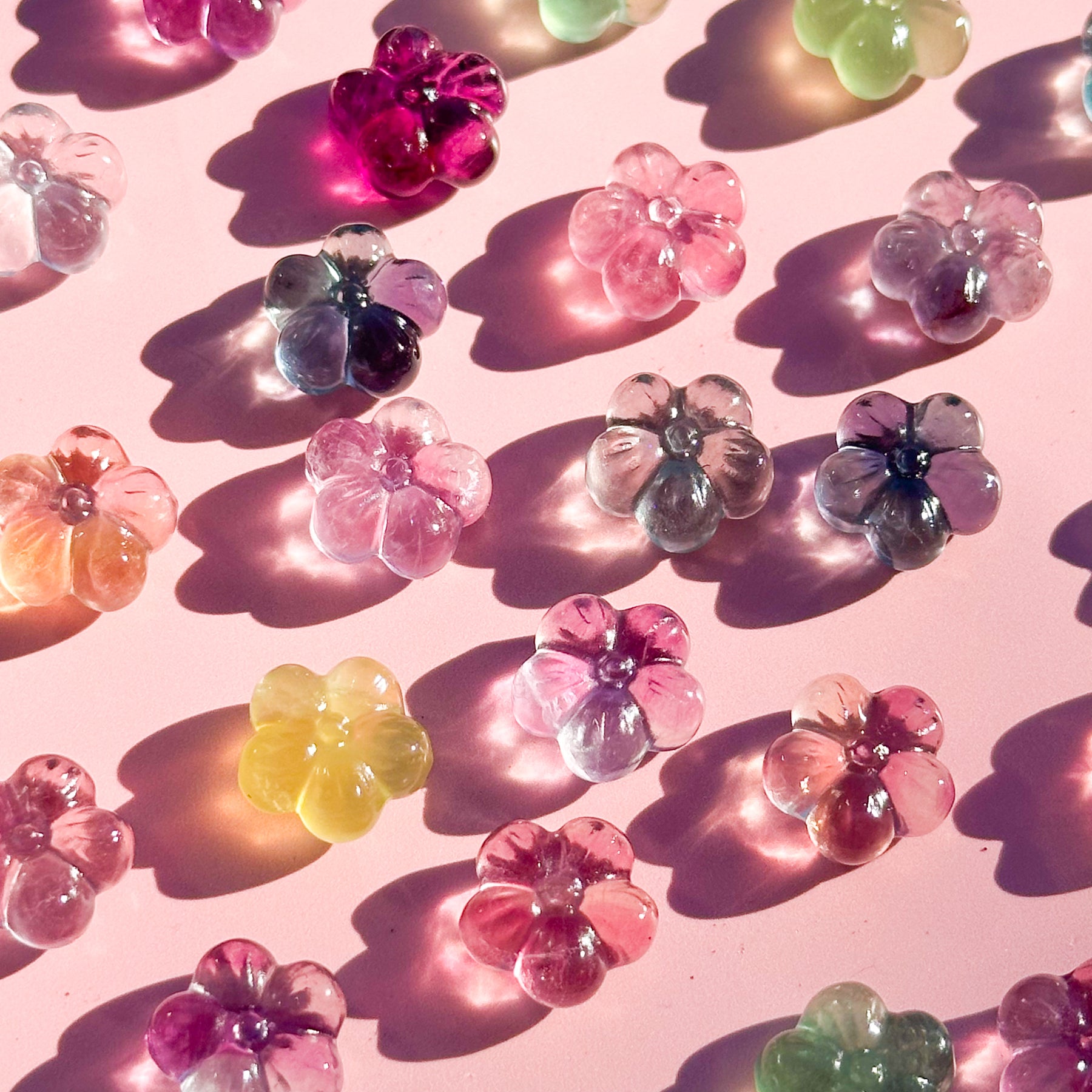 This Fluorite mini flower is a beautifully carved piece made from natural rainbow fluorite, featuring soft bands of purple, green, and clear tones. Each flower is unique, showcasing the stone's natural variation and gentle translucence. Fluorite is often associated with emotional healing, growth, and harmony. Fluorite can enhance intuition, promote peace and protection, and bring calm to a chaotic mind. Place this Fluorite flower in your office, study, or living space to improve concentration, protect against stress, and bring harmony to your environment.