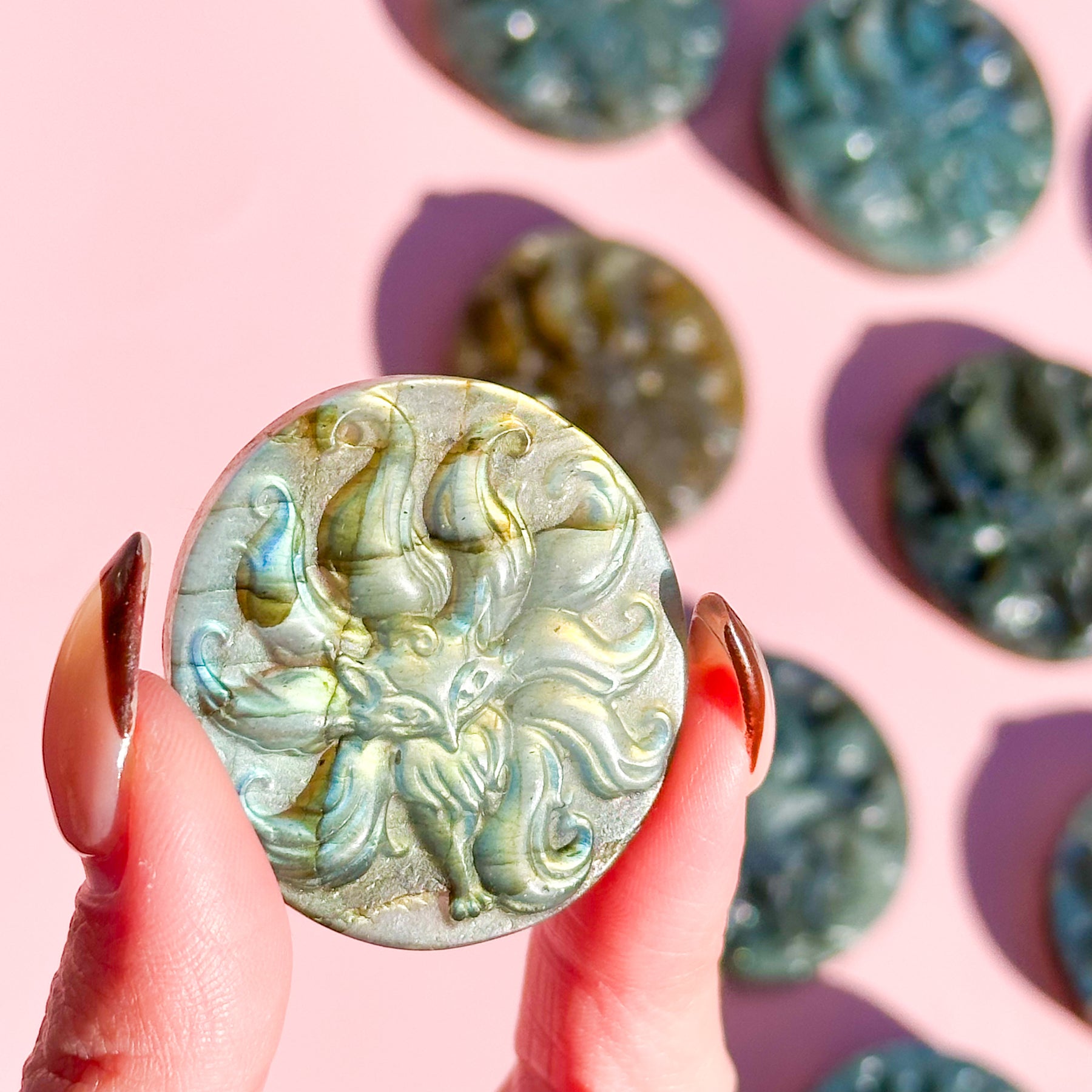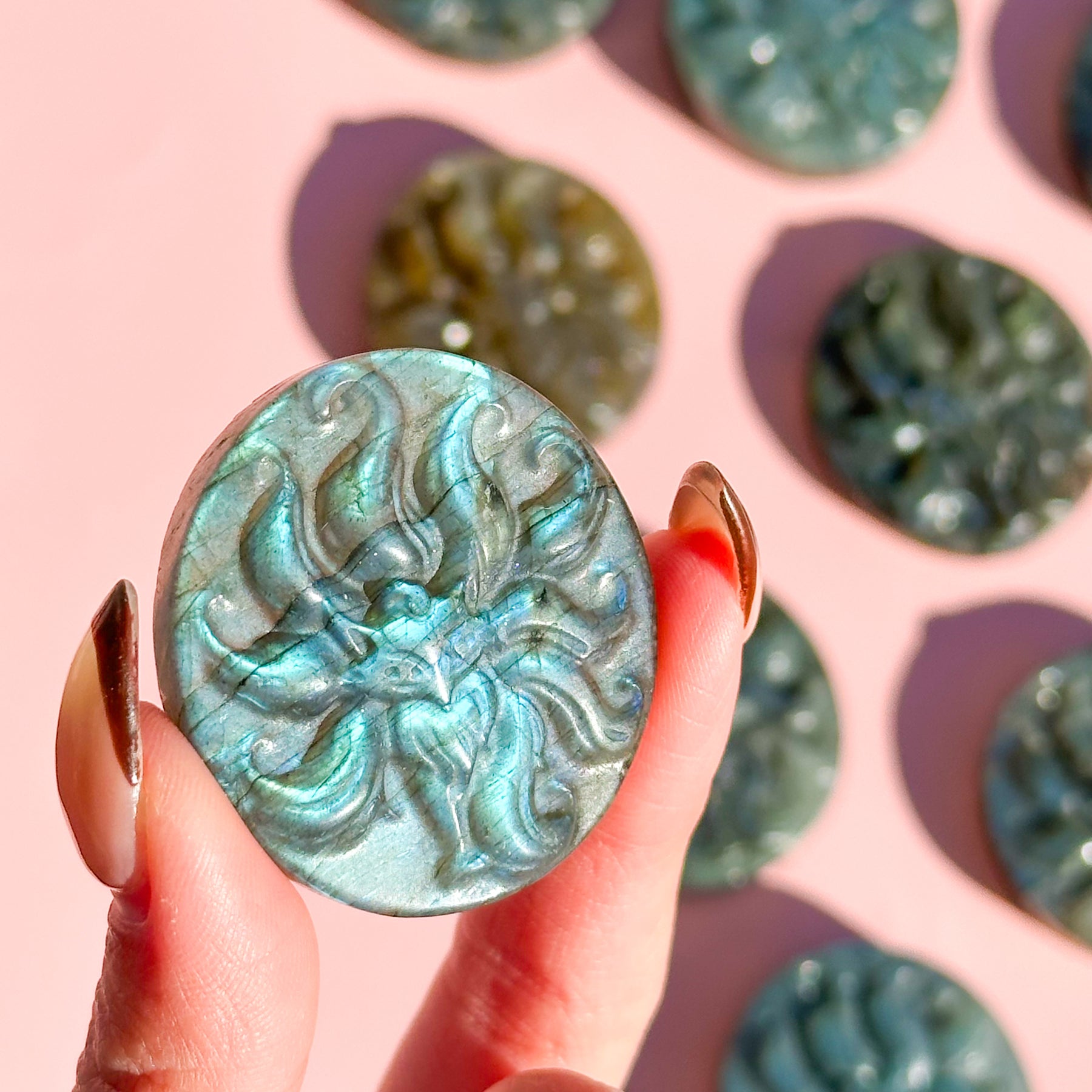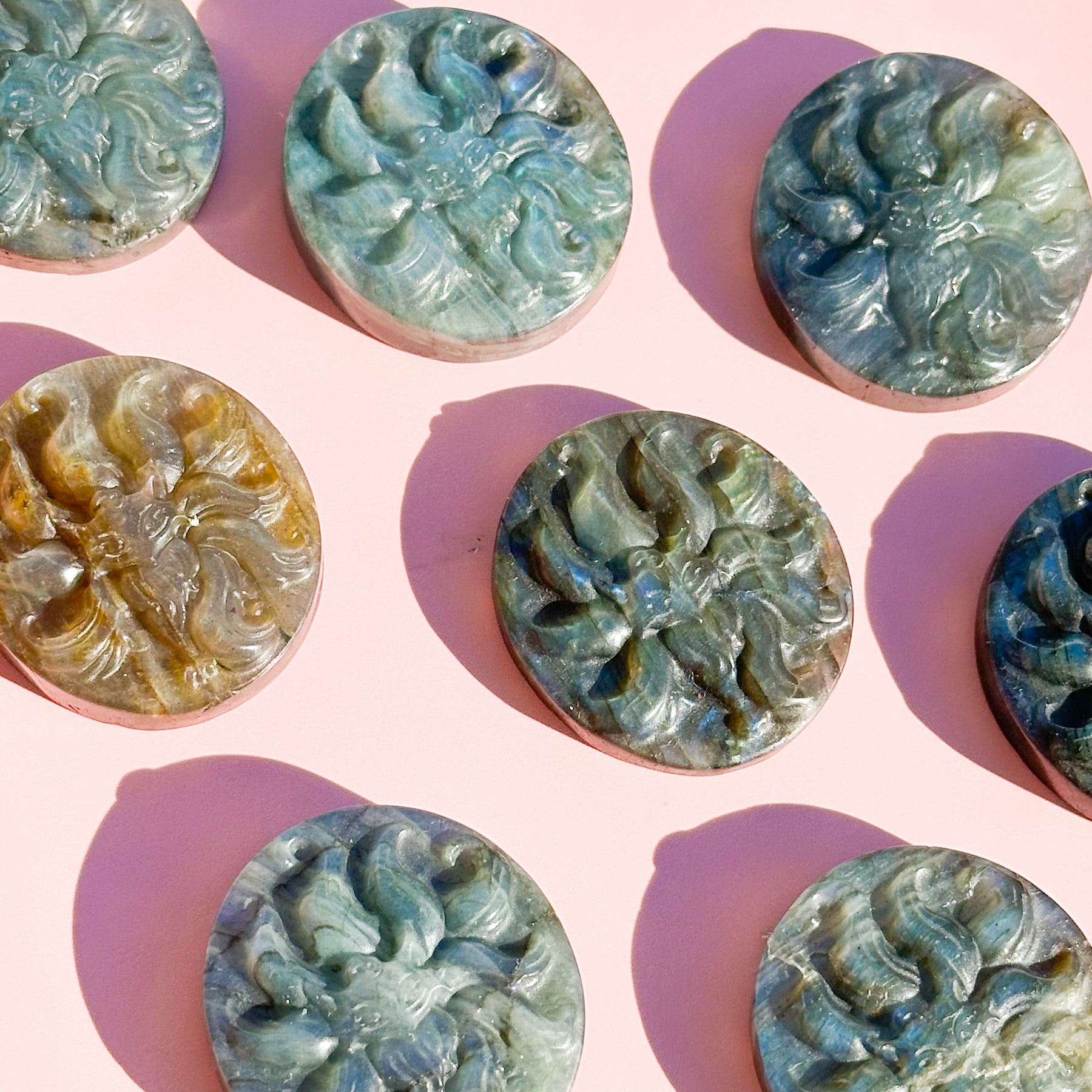 This stunning Labradorite Disk features vivid green, blue, and gold colors, and changes dramatically as the viewing angle or lighting changes, which makes its shimmering colors similar to the ocean. Hand-carved from genuine Labradorite and inspired by ocean hues, this stone is labradorescense at its finest. Labradorite is often used to impart strength and perseverance in users, protect the aura from negative energies, and stimulate the imagination. Labradorite is known for its protective and intuitive energy, making this piece both decorative and meaningful. Whether used in your crystal practice or as a unique accent piece, this shell is sure to stand out.