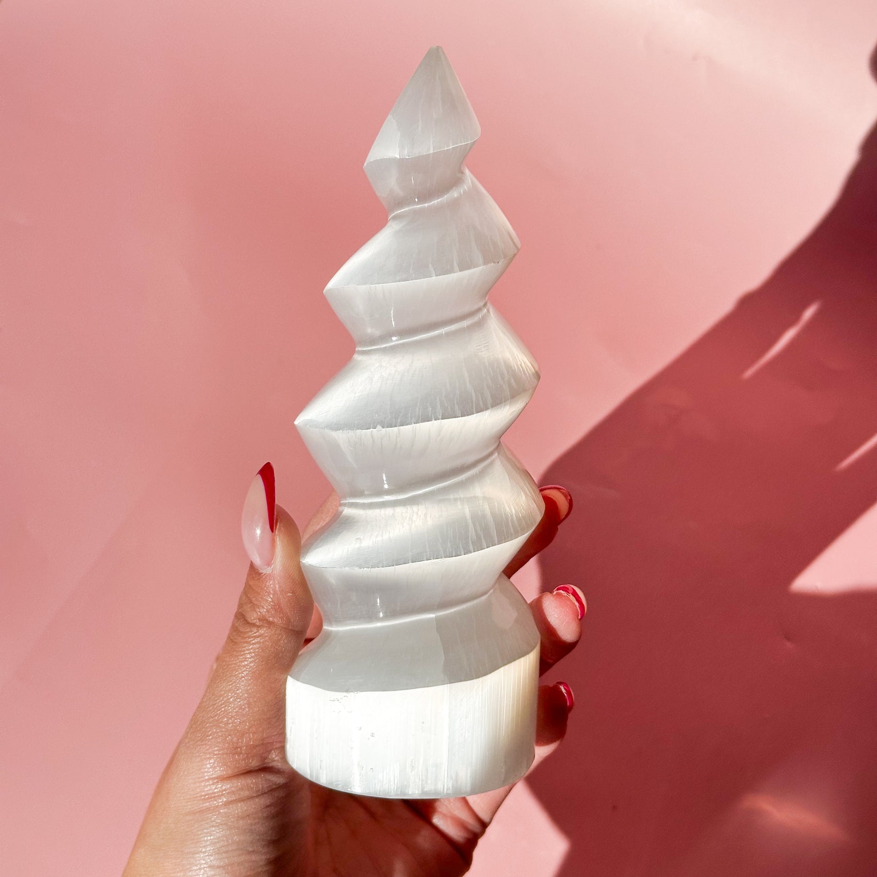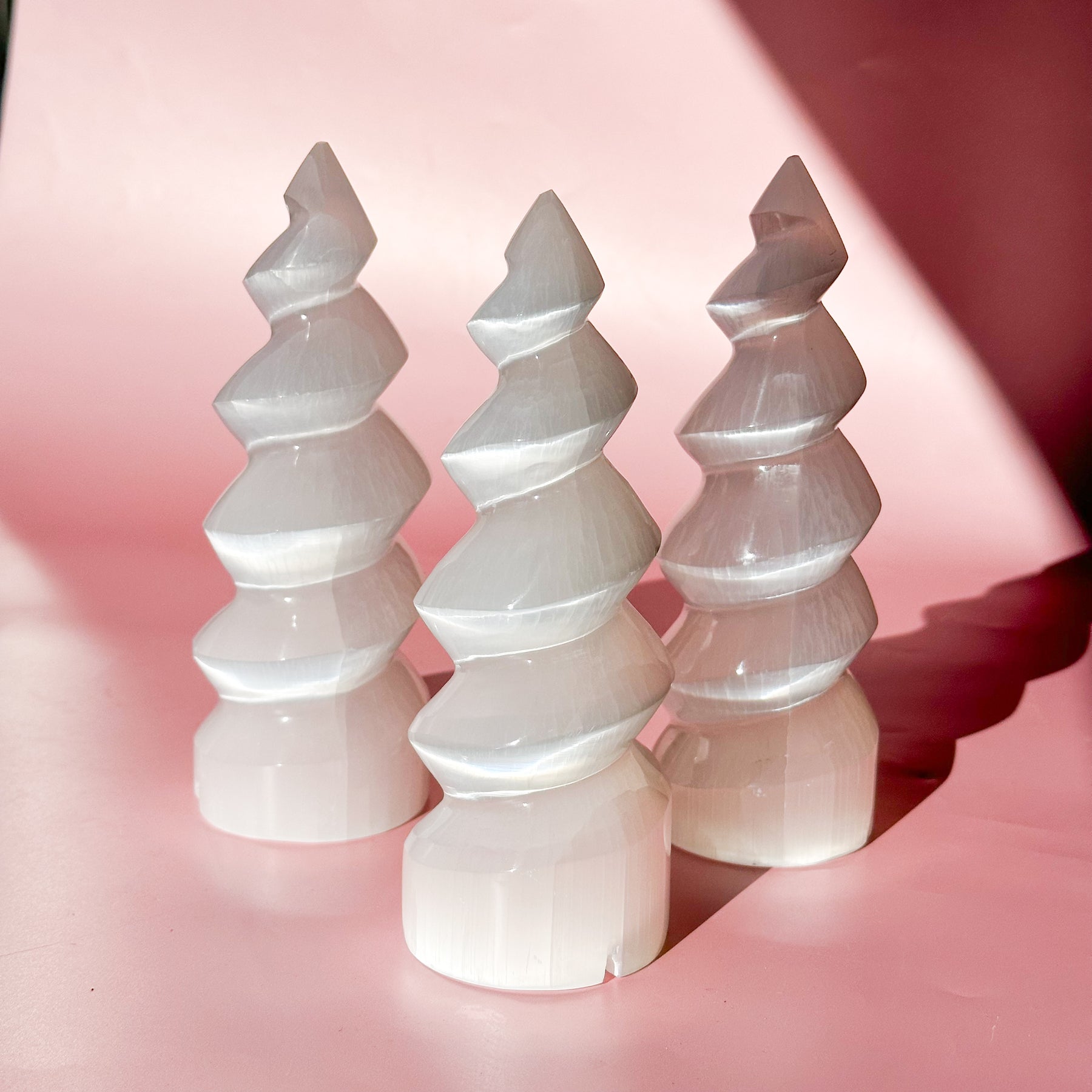 The tree shape symbolizes strength, growth, connection, and resilience. It represents the connection between heaven and earth through its roots and branches, and can symbolize life, knowledge, and the interconnectedness of all living things. Place this selenite tree in a room or altar to cleanse and charge your crystals, bringing them back to their full potential. This Satin Spar Selenite tree is a beautiful, ethereal translucent white with a stunning flash when put in different lighting.