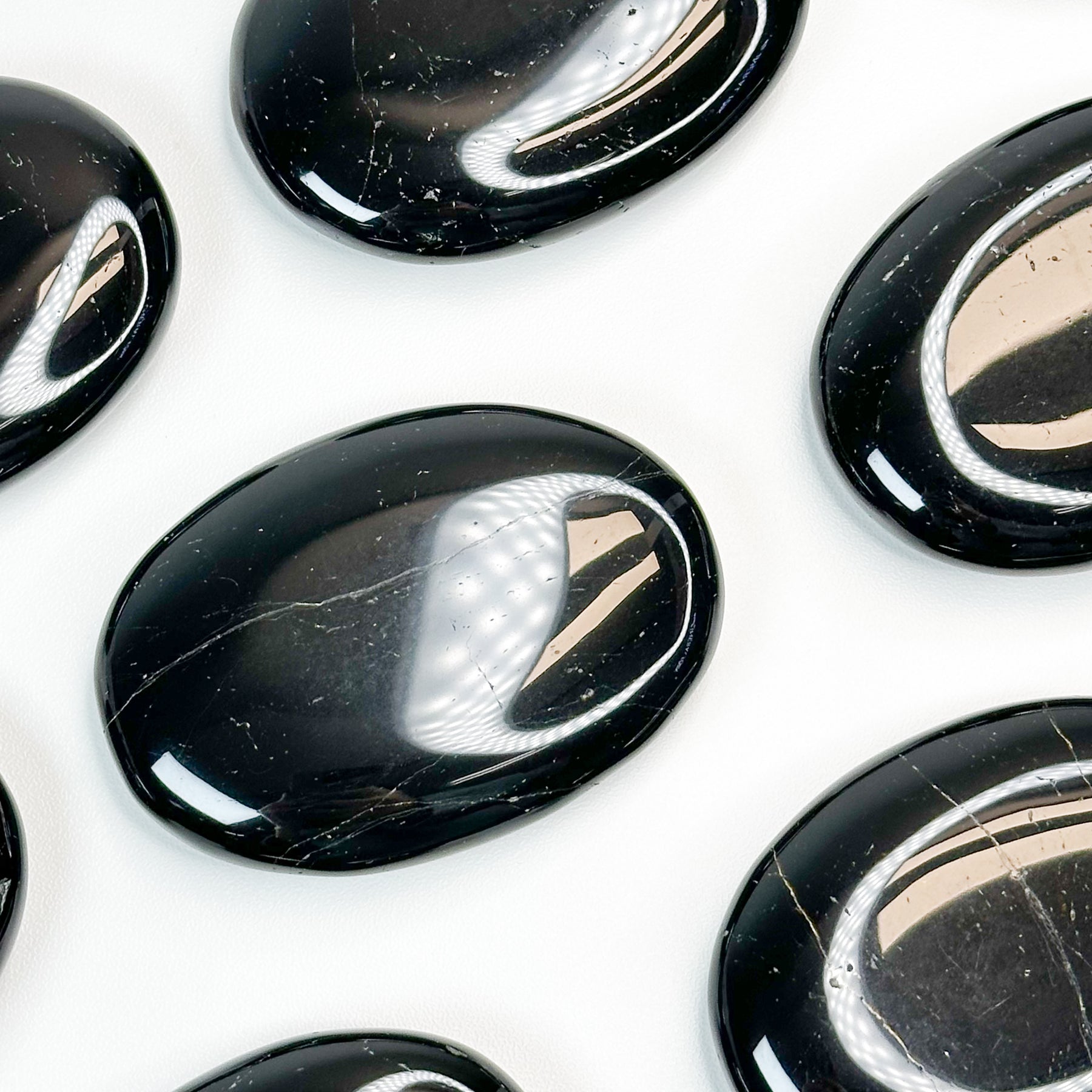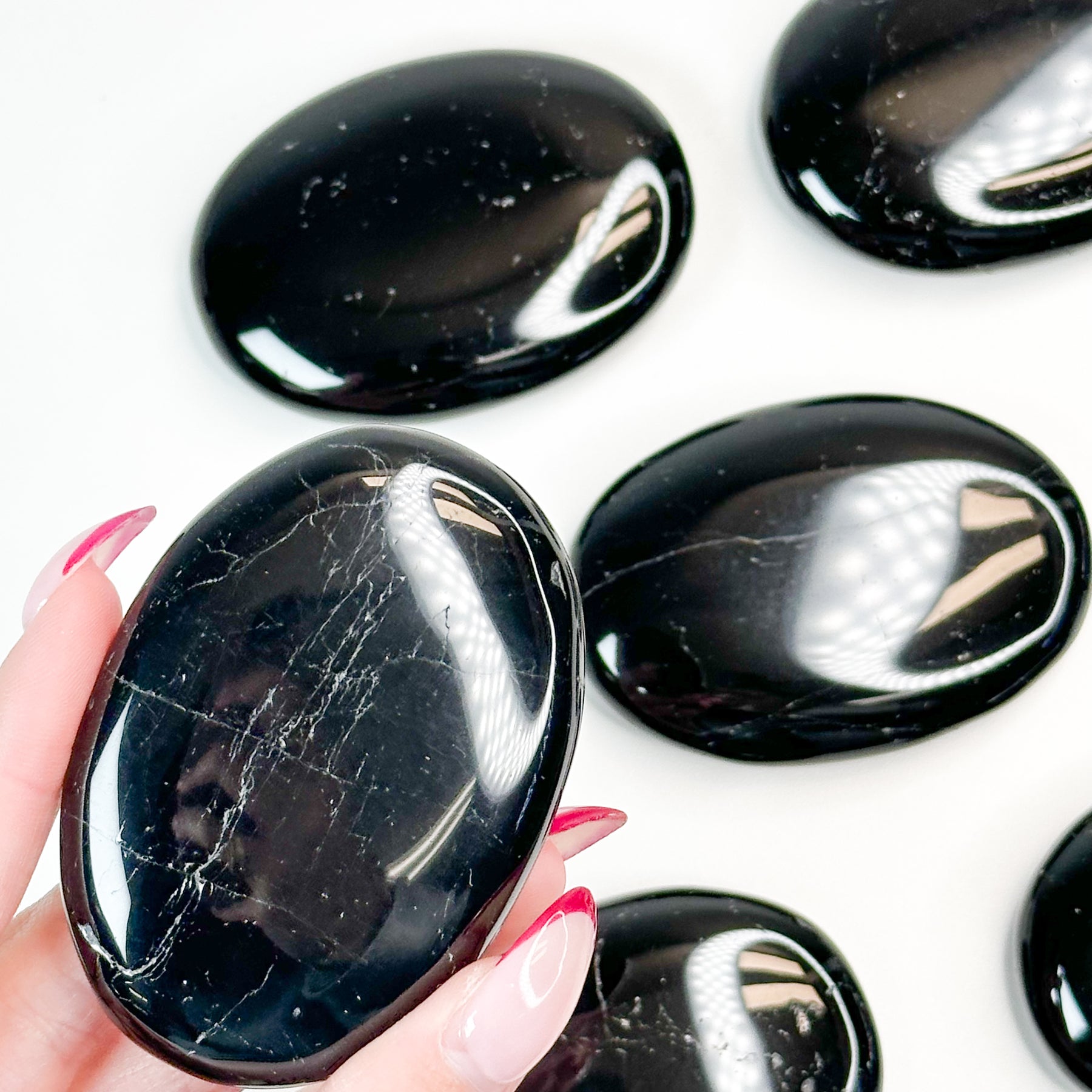 These black tourmaline palmstone has beautiful striated lines and tiny flecks of white throughout each stone, giving it a unique and eye-catching appearance. Tourmaline is a powerful protective stone that can block negative, toxic, or harmful energies and turn them into positive energy that can promote inner peace, dispel fear, and help stabilize emotions. This powerful stone is the perfect addition to any collection, whether it's to carry every day or place in a room. Black tourmaline is the perfect stone to bring protection to its user.