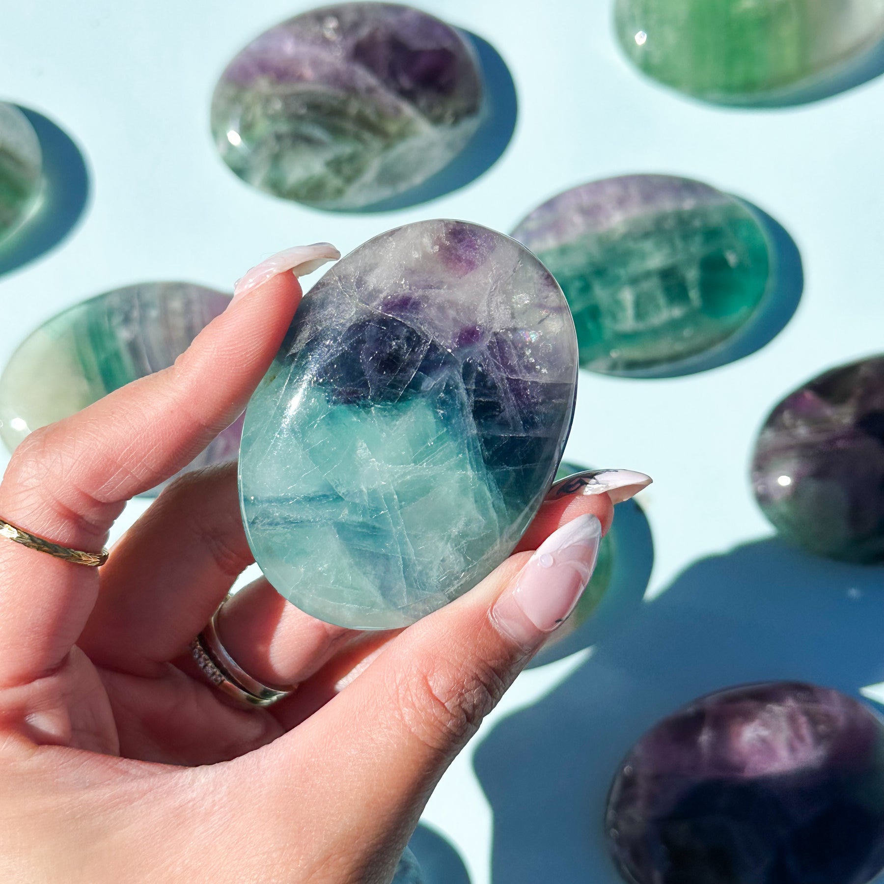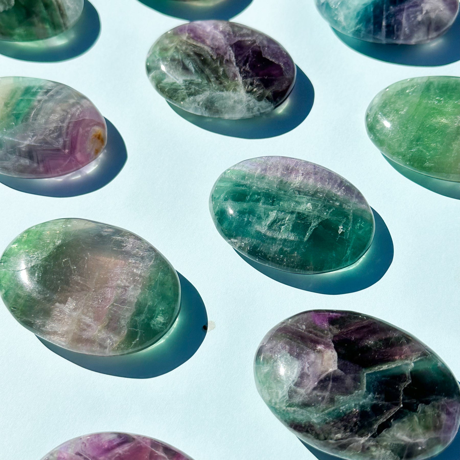 This Fluorite Palmstone is a unique piece made from natural rainbow fluorite, featuring soft bands of purple, green, and clear tones. Each palmstone is unique, showcasing the stone's natural variation and gentle translucence. Fluorite is often associated with emotional healing, growth, and harmony, and can enhance intuition, promote peace and protection, and bring calm to a chaotic mind.