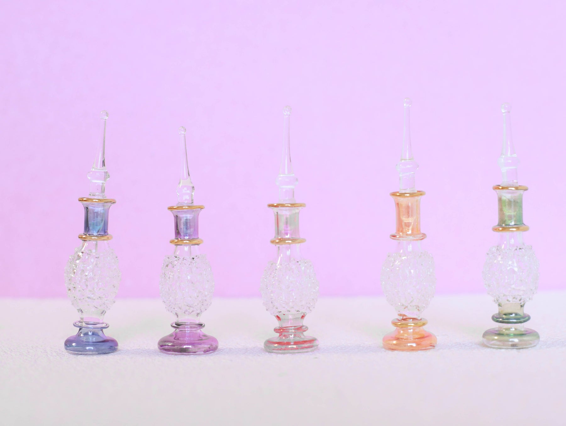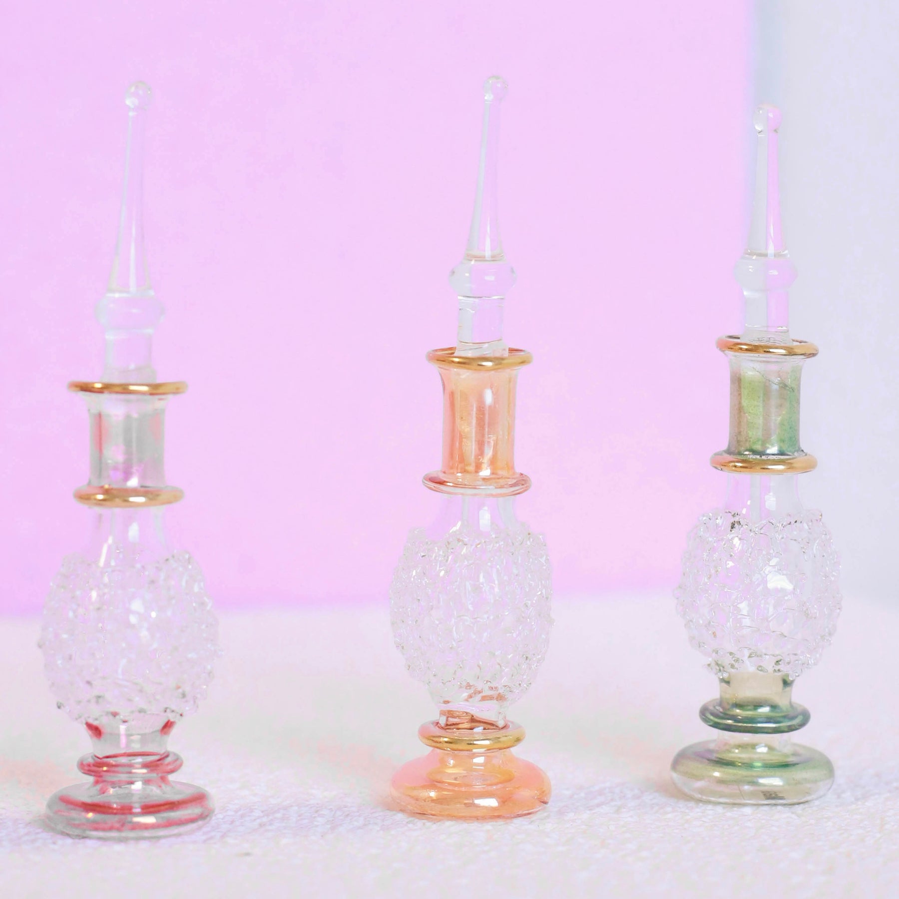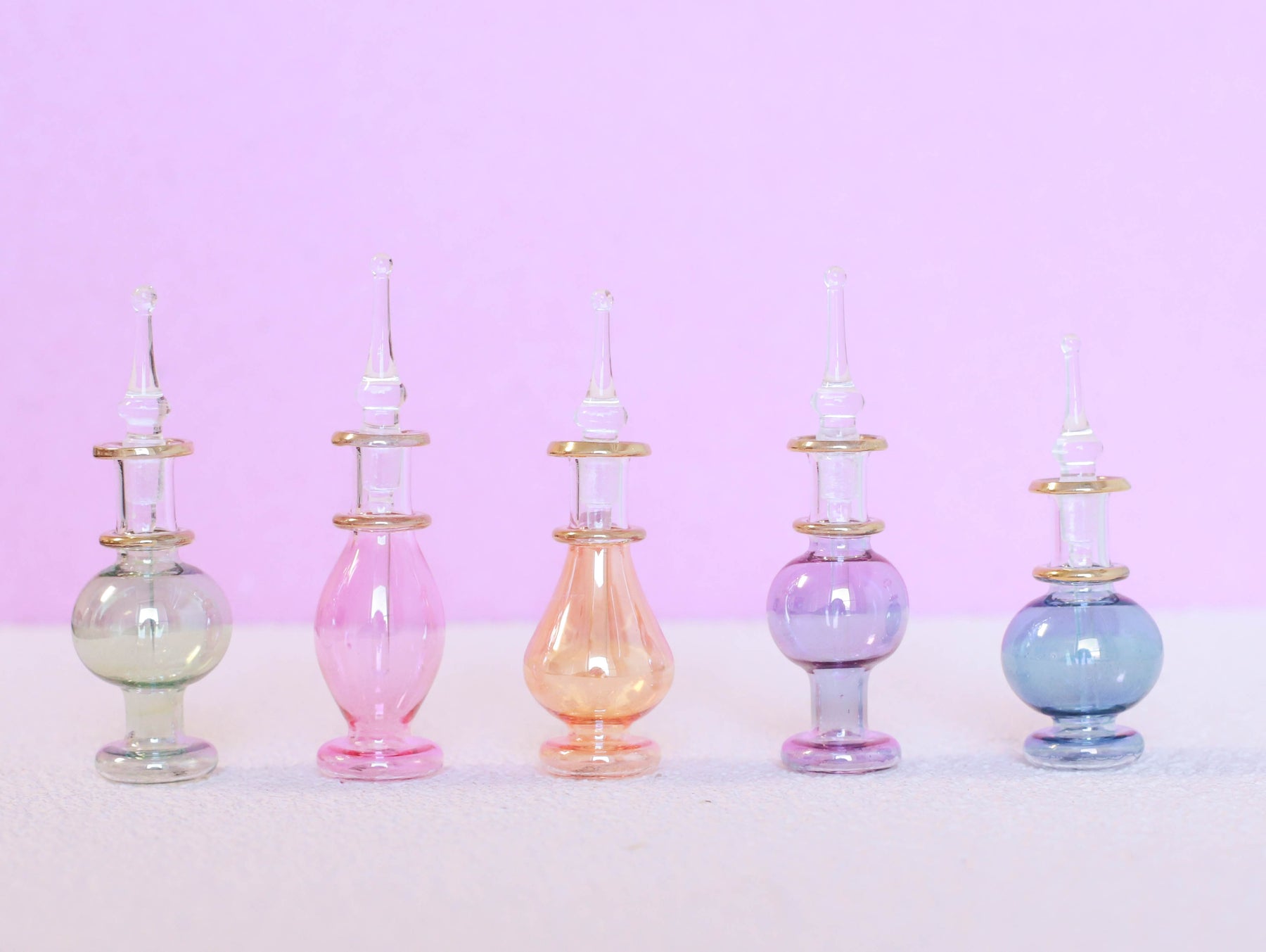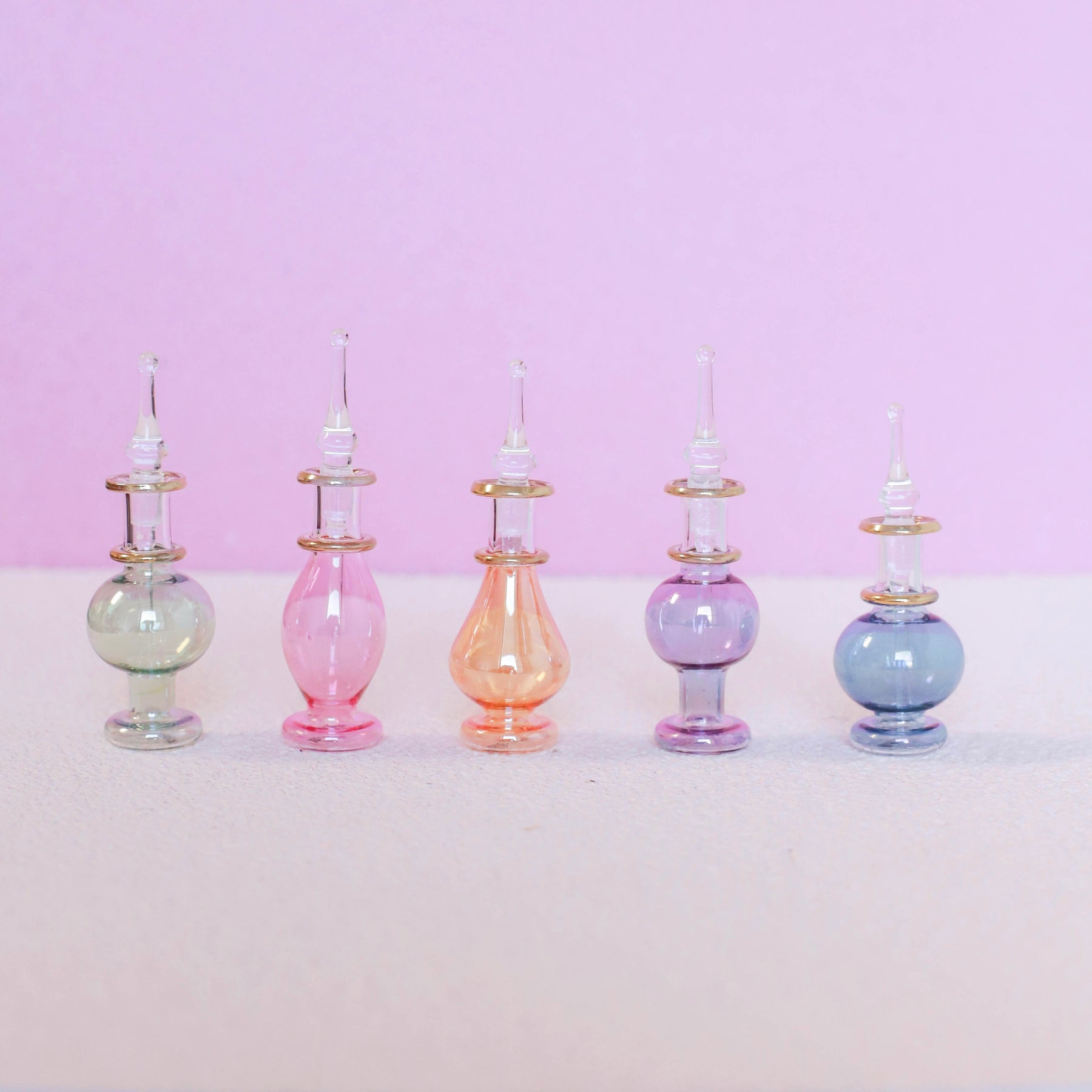 The miniature glass perfume bottles are the perfect addition to a vanity, tray, or gem collection. Crafted with delicate curves and shimmering gold-toned accents, each bottle features a unique silhouette and a soft, ethereal color palette. While they do not contain liquid, their translucent finish beautifully catches the light, making them a stunning choice for decorative displays.