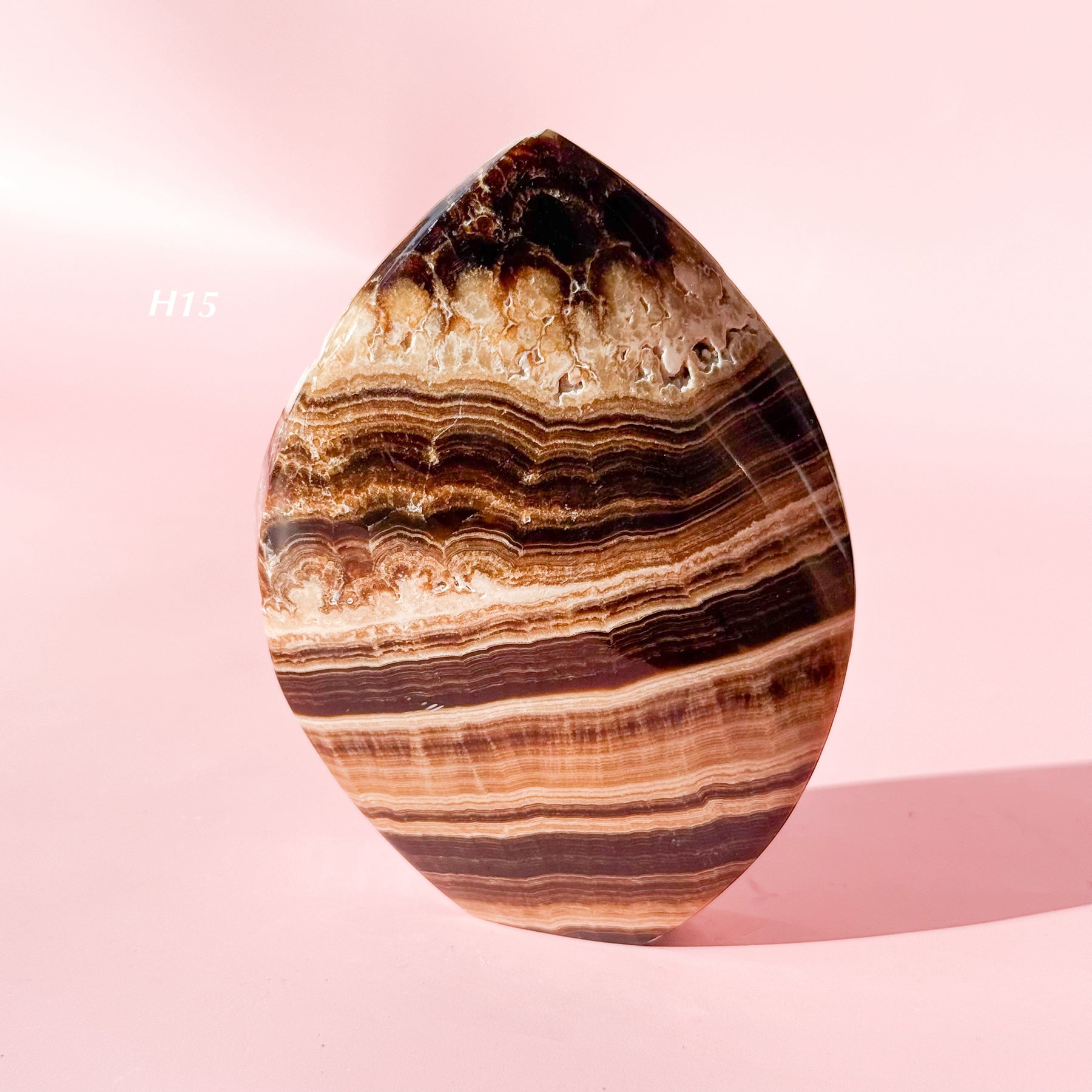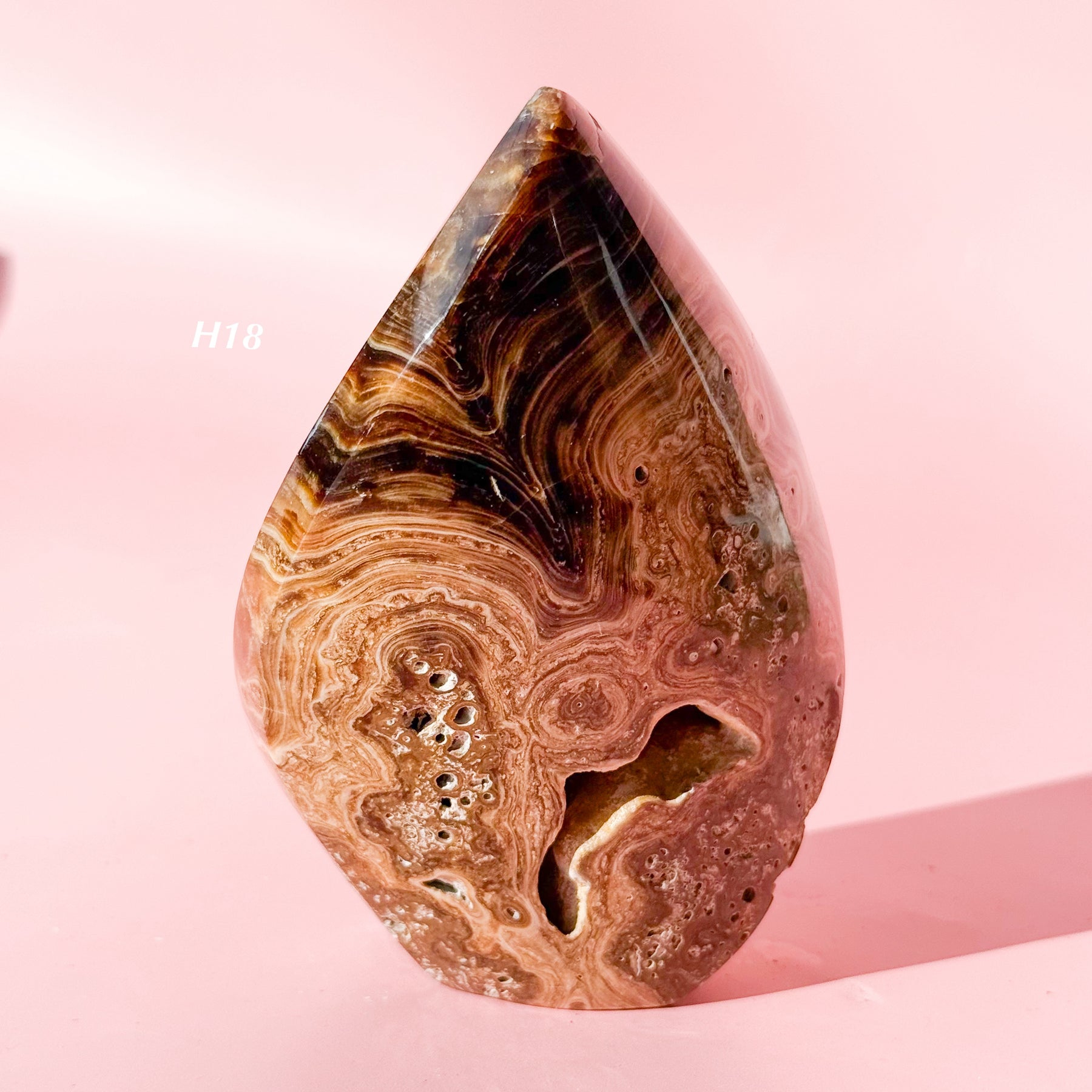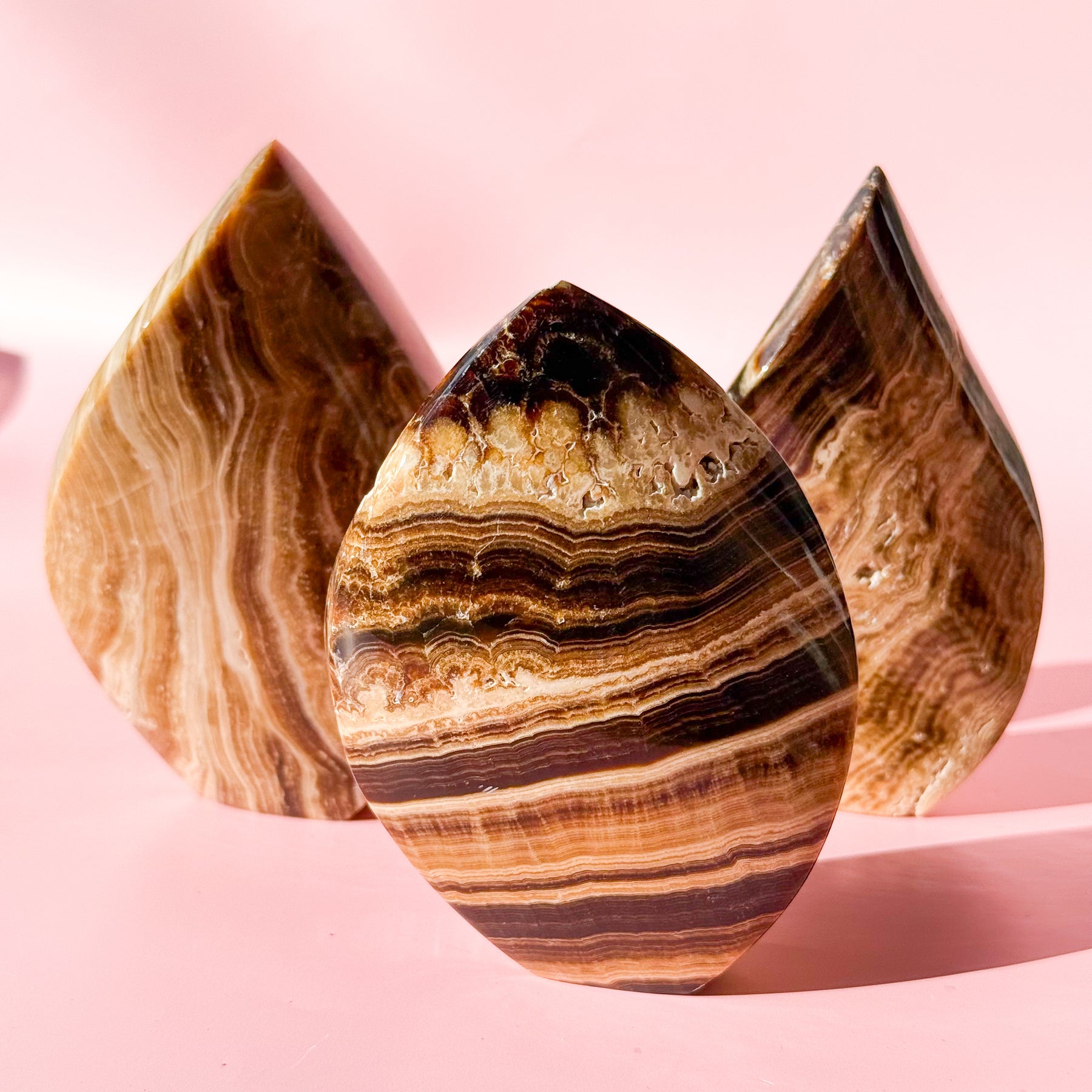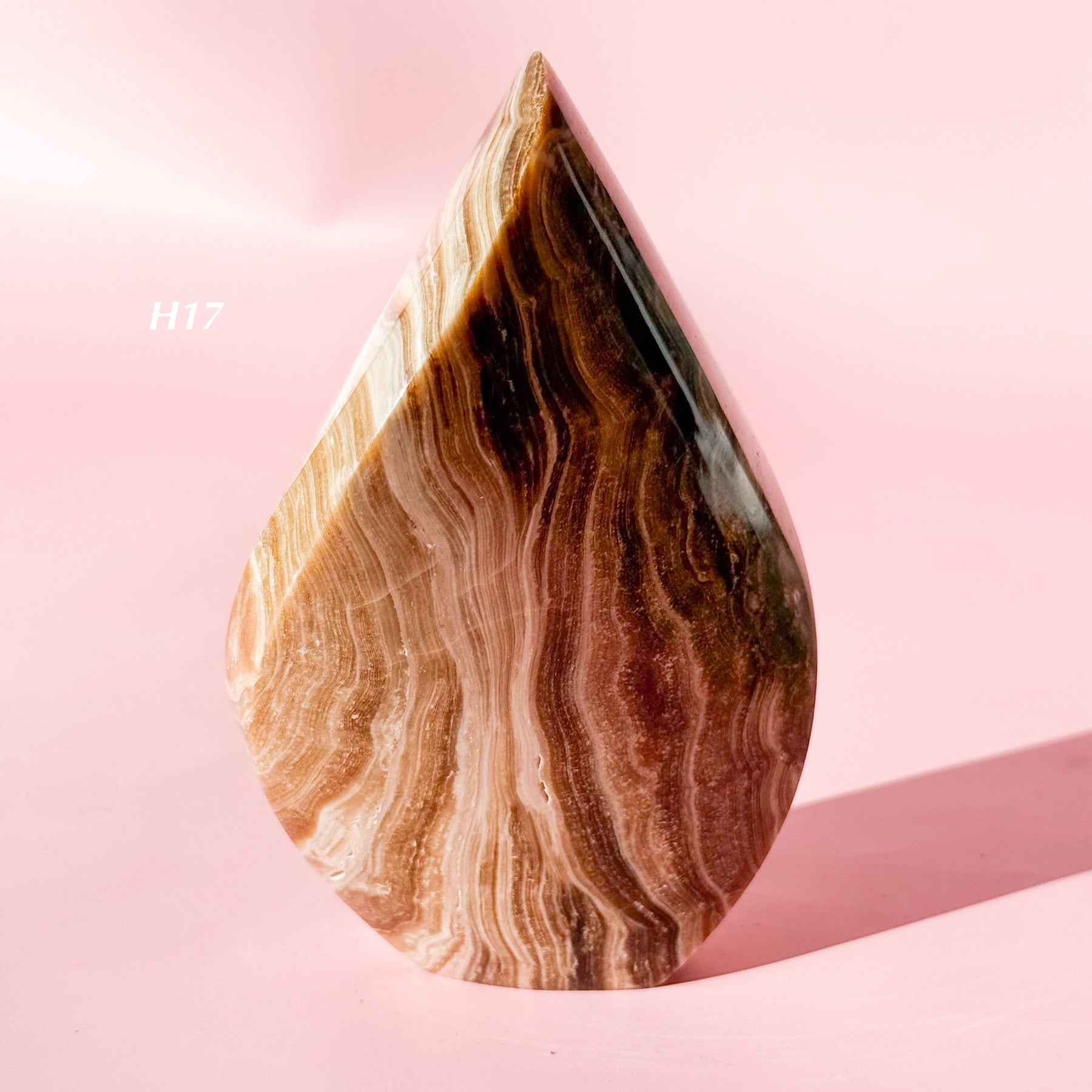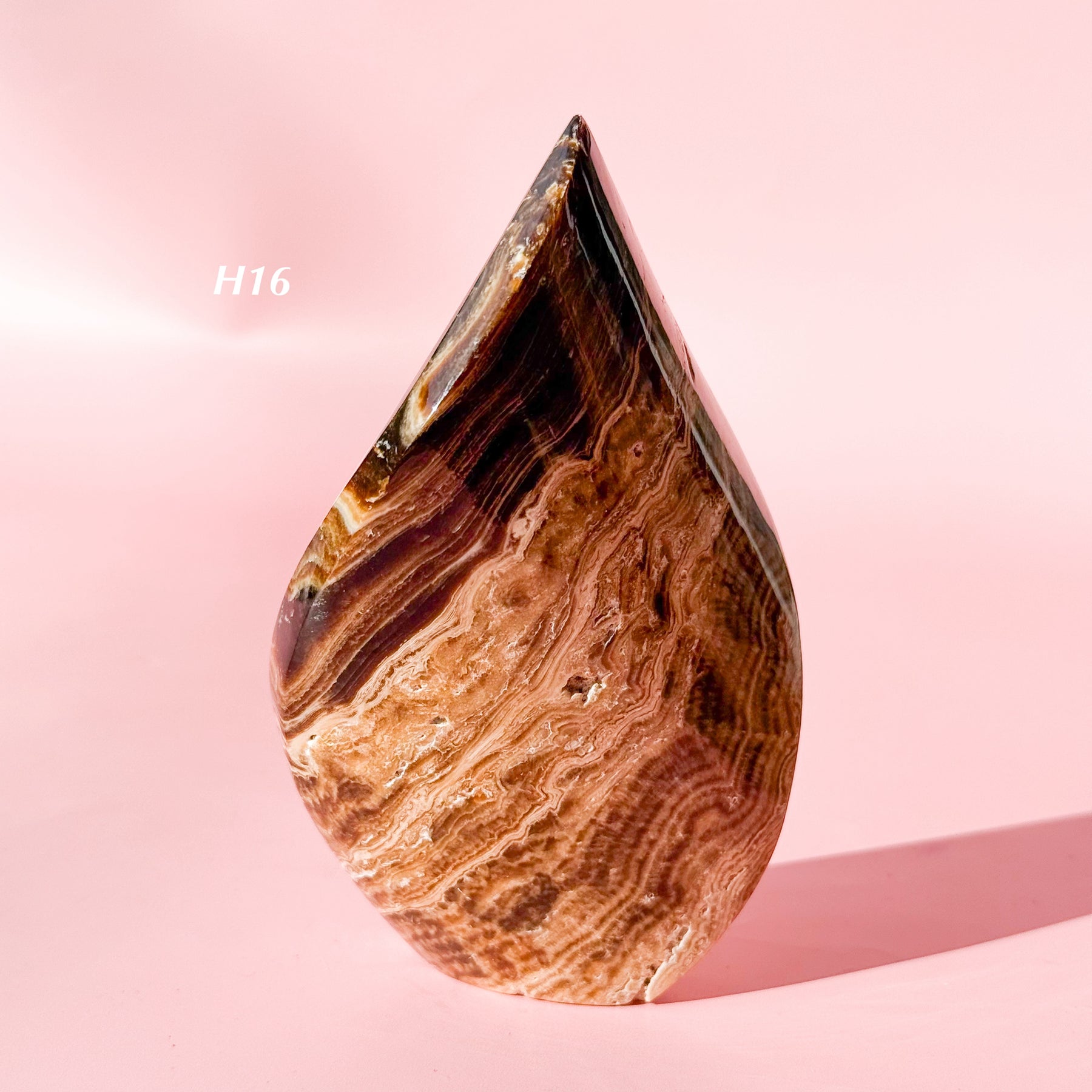 This chocolate calcite flame features a delicious range of deep cocoa, warm brown, and creamy latte browns. It often features banding or ribbons of color that look like layered chocolate or wood grain. Chocolate Calcite is a deeply comforting and stabilizing stone. Its rich, earthy tones and physical weight make it a favorite for those seeking to anchor themselves during times of significant change or mental scatteredness. It is highly effective at grounding high-vibrational energy into the physical plane. It helps you take spiritual insights and turn them into practical, everyday actions. Known as a stone of inner strength, it provides a sense of security and stability, helping to soothe anxiety and fear about the future. It assists in clearing out mental clutter and stuck thoughts, allowing for a more focused and disciplined approach to your goals.