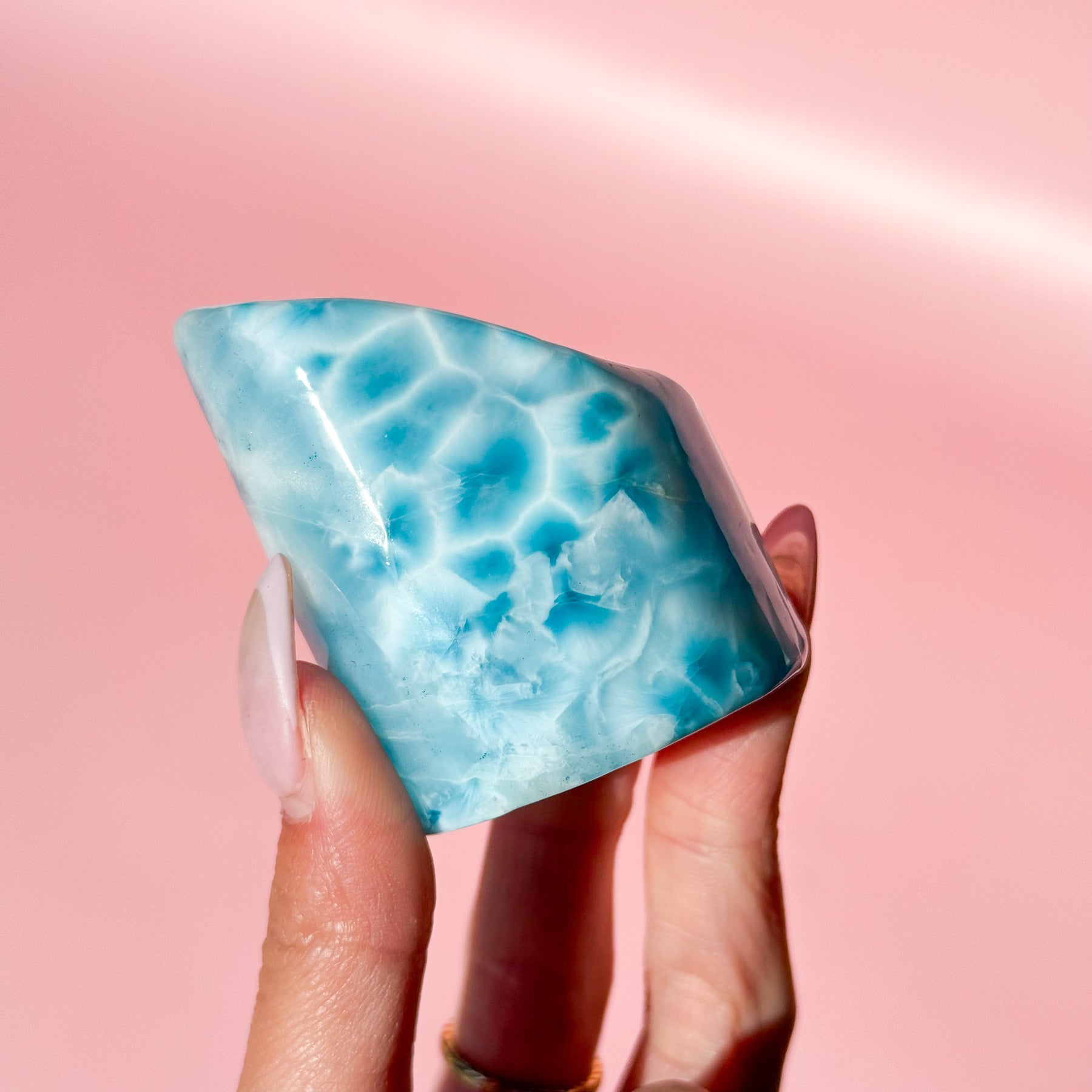This stunning larimar freeform showcases the stone’s signature oceanic blues, accented with soft white marbling reminiscent of Caribbean waves. Hand-polished to highlight its natural beauty, each piece is truly one-of-a-kind, carrying the calming energy and soothing presence Larimar is known for. Perfect for display, meditation, or as a centerpiece in your collection, this high-quality freeform connects you to tranquility, balance, and the nurturing energy of the sea.
