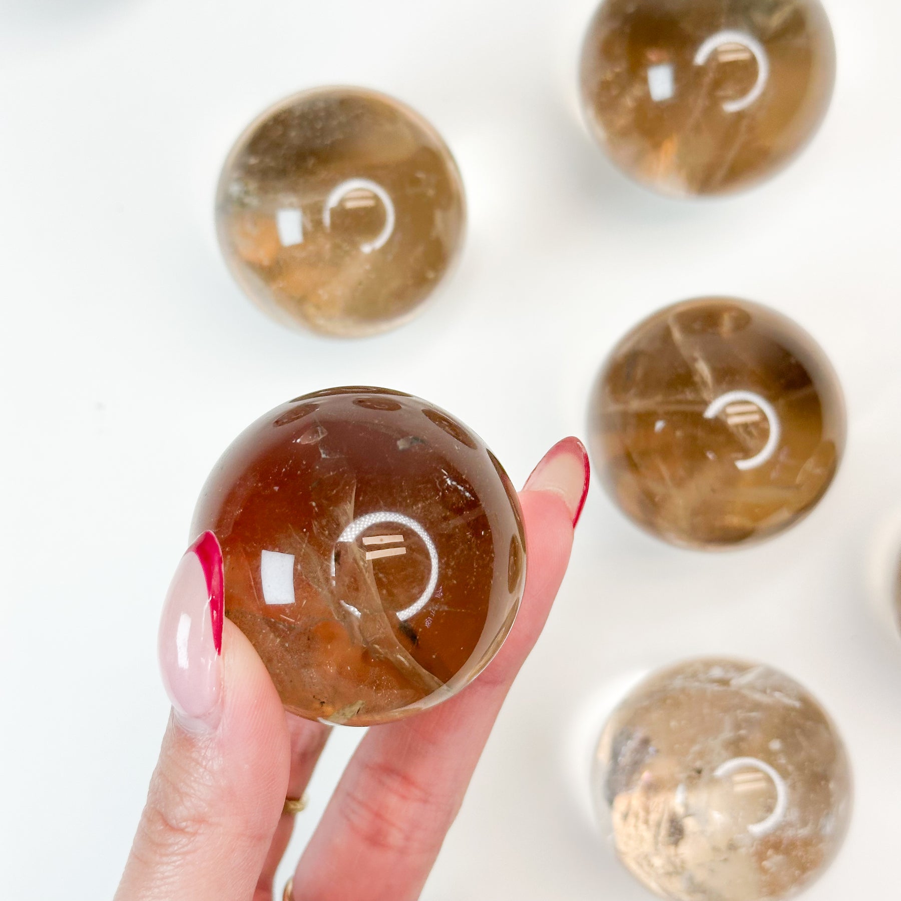 This smokey quartz is carved into a sphere shape, which symbolizes wholeness, unity, eternity, and infinity. The continuous, unbroken surface represents the cyclical nature of life.
